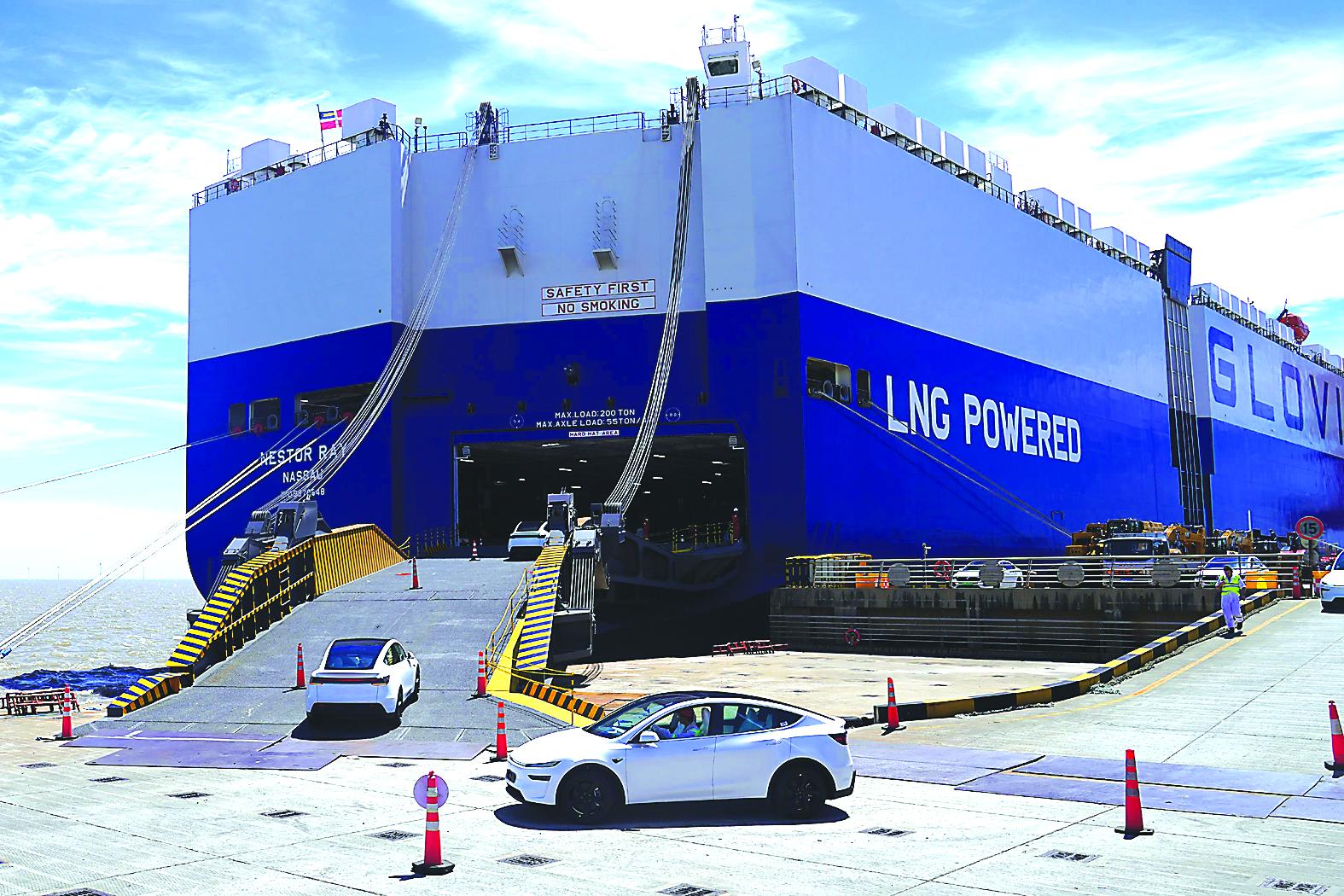 2025年7月2日,在上海自贸试验区临港新片区南港码头,一批新能源汽车驶向一艘滚装货轮。