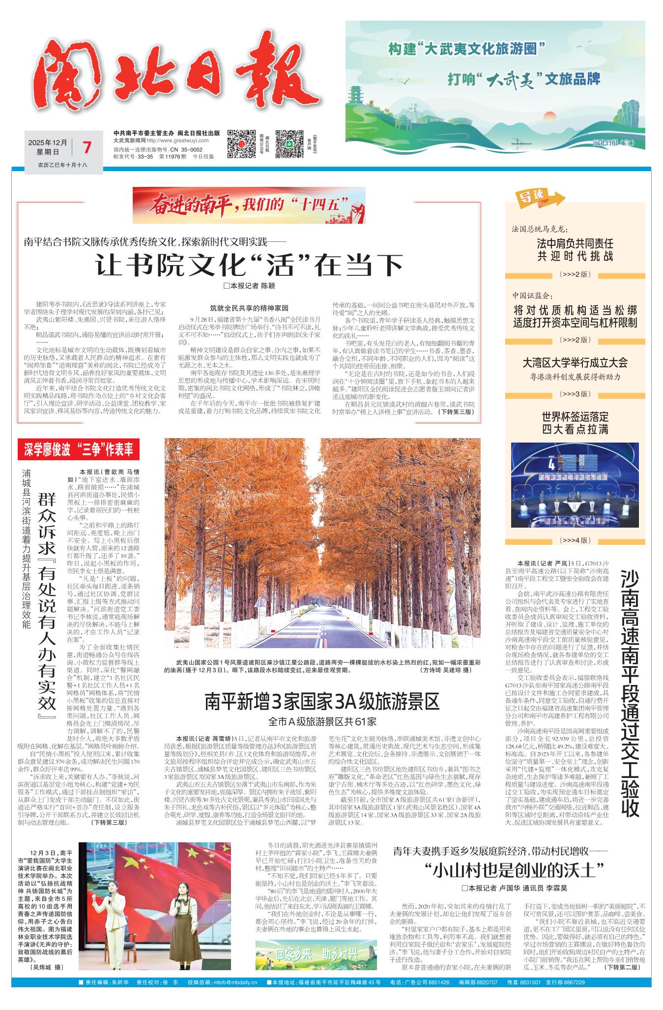 本报讯(记者 蒋雪娇)5日,记者从南平市文化和旅游局获悉,根据《旅游景区质量等级管理办法》和《旅游景区质量等级划分》,经相关县(市、区)文化体育和旅游局推荐,市文旅局按程序组织综合评定并完成公示,确定武夷山市五夫古镇景区、浦城县梦笔文化园景区、建阳区三色书坊景区3家旅游景区为国家3A级旅游景区。