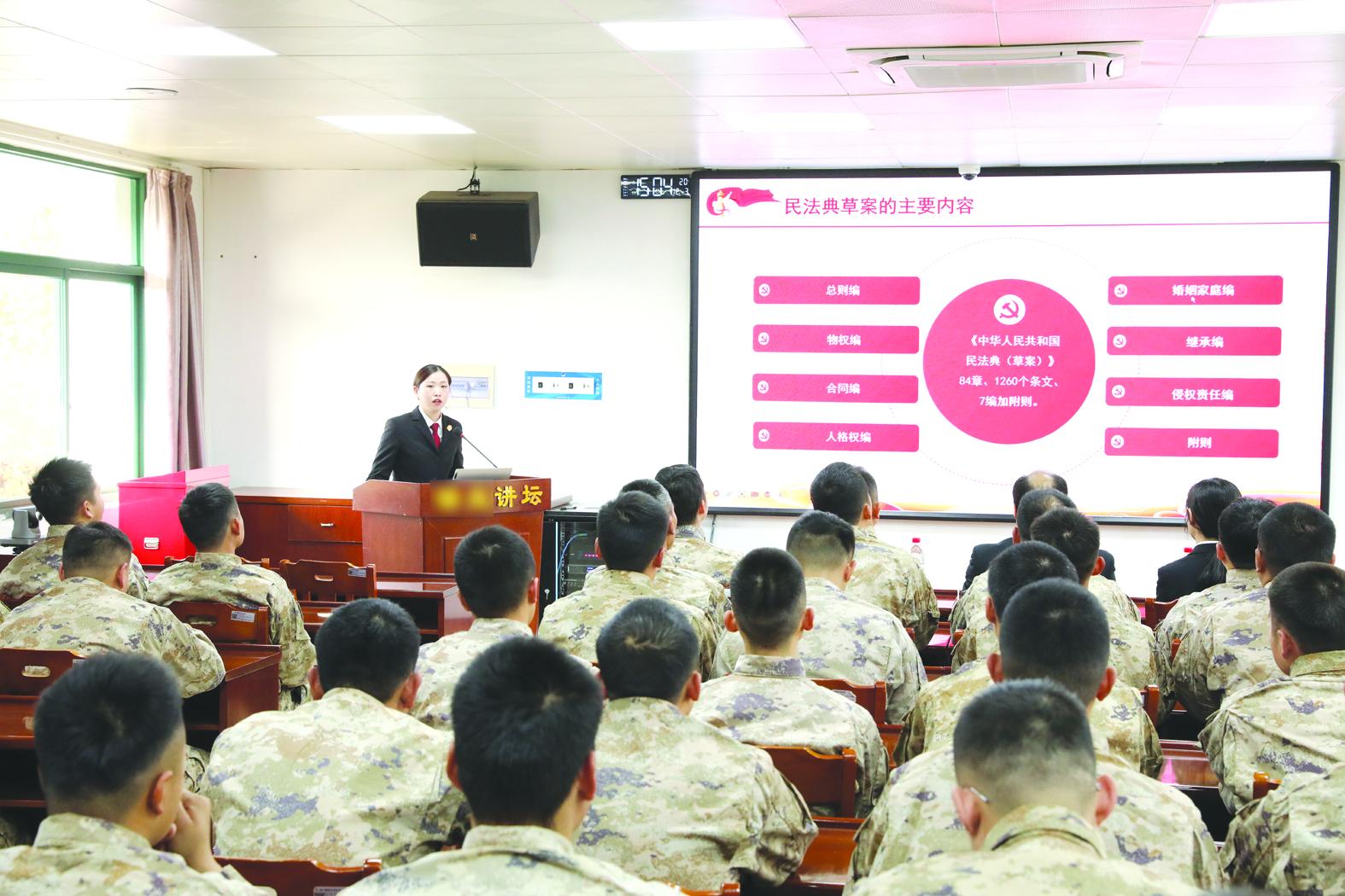 近日,武夷山法院开展“送法进军营”活动,为驻地某部官兵送上精准实用的法治服务。法院干警围绕官兵关切的问题,精选《中华人民共和国民法典》相关条款,结合典型案例,重点解读买卖合同、遗产继承、交通事故处理等法律问题。 (王若曦 张慧云 摄)