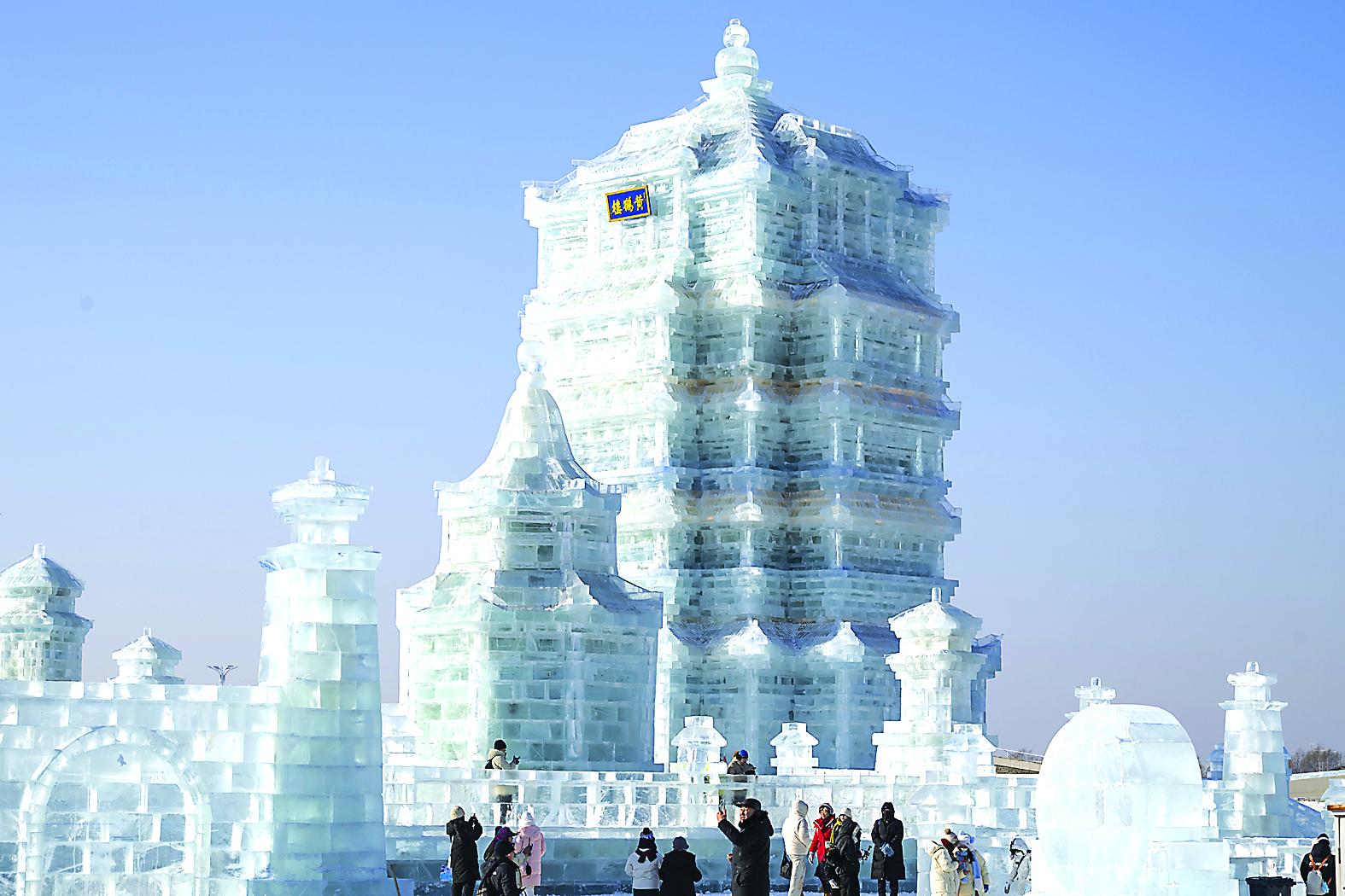 12月17日,游客在哈尔滨冰雪大世界园区游玩。以武汉黄鹤楼为原型的冰建,充满“鹤影掠空”的东方意境。