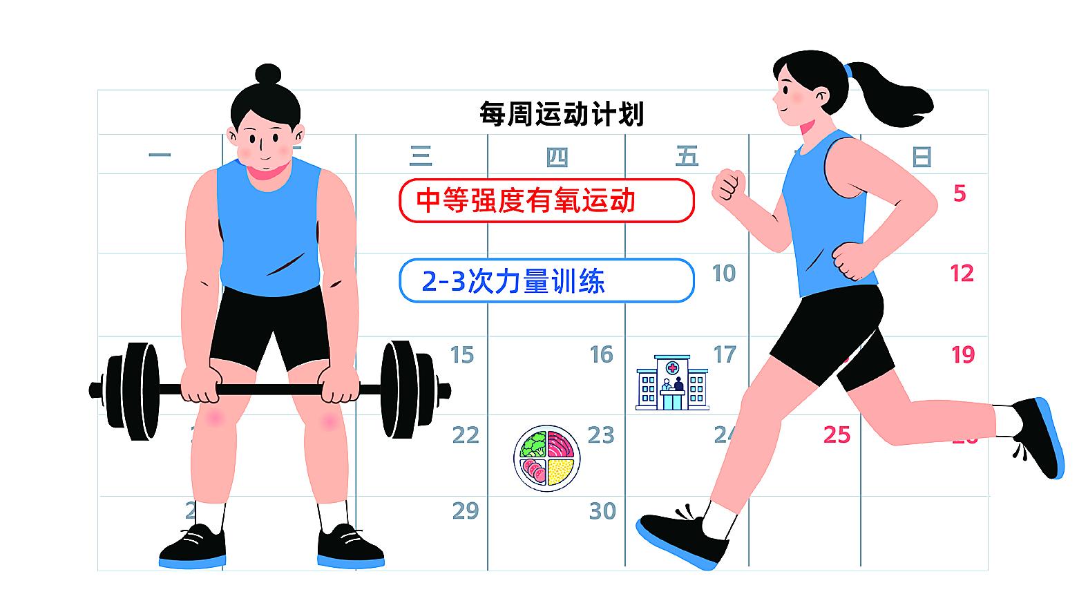 第三步是科学运动,兼顾有氧与力量。“运动不仅能消耗热量,还能增加肌肉量、提高基础代谢,帮助长期维持体重。”徐晓薇建议,每周进行中等强度有氧运动,比如快走、慢跑、游泳、骑自行车等;同时搭配2-3次力量训练。“肌肉量增加后,基础代谢会提高,每天能消耗更多热量,还能改善体型,让身体更紧致。”