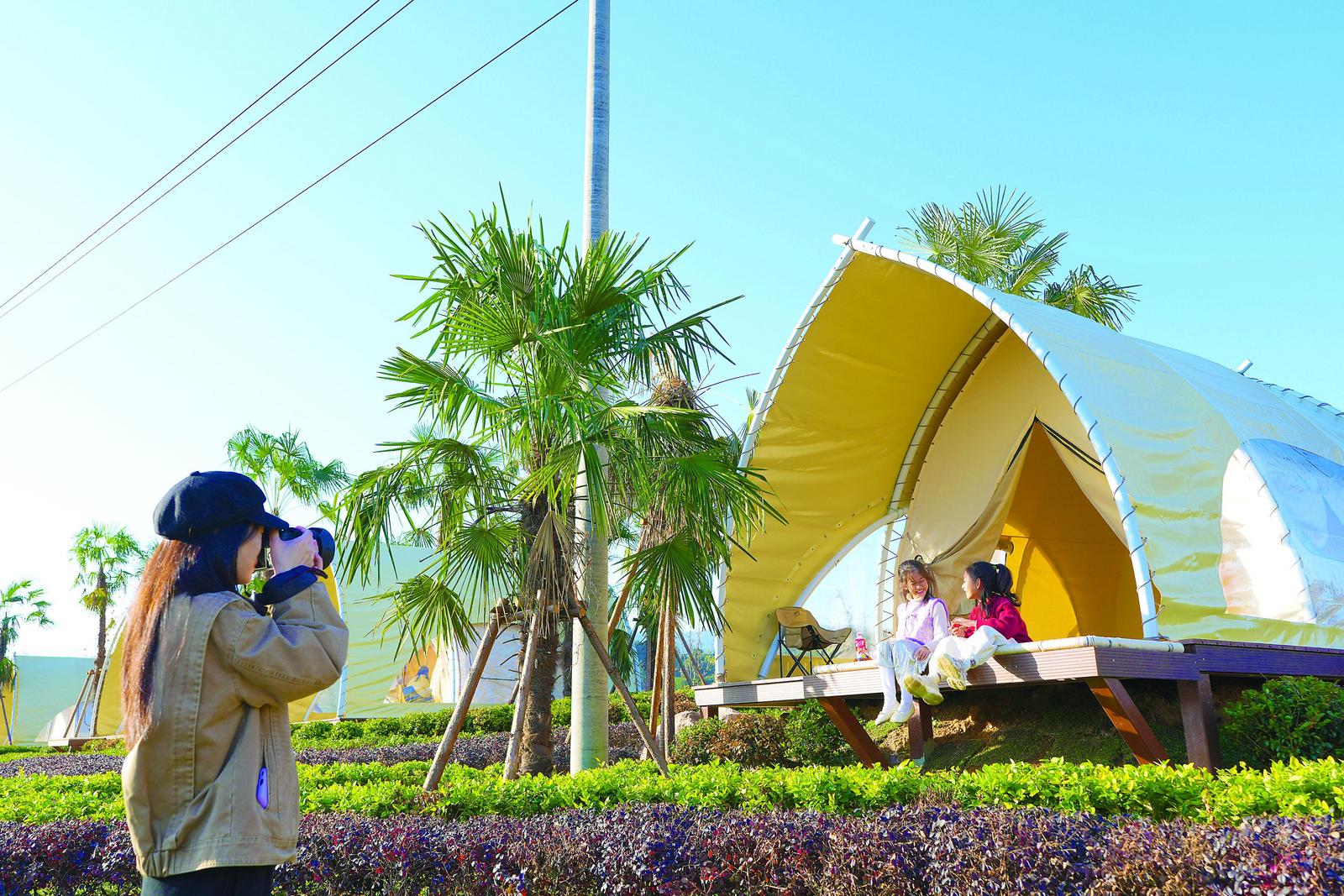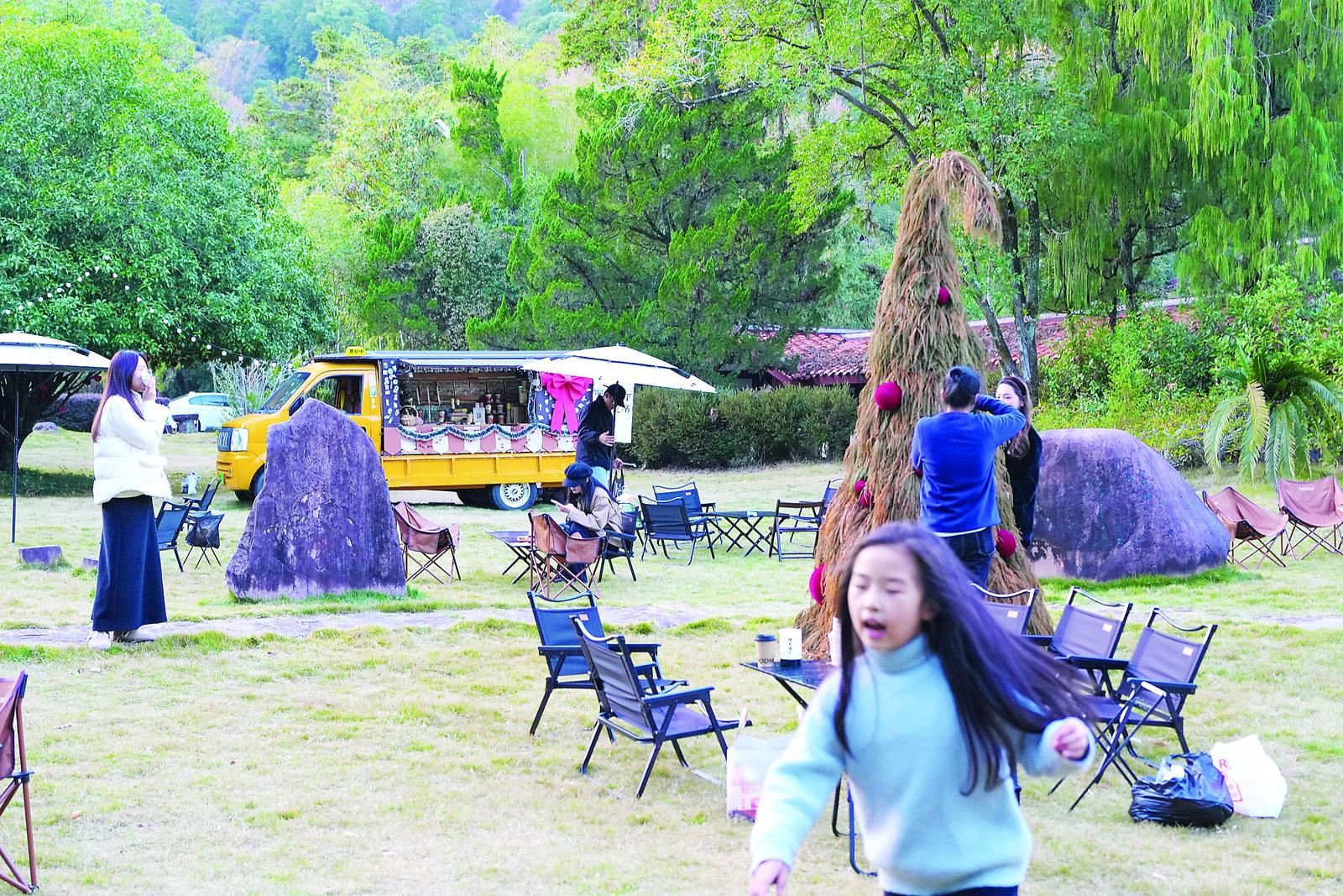 位于武夷山景区的武夷山庄营地则是另一番温馨景象。幔亭峰下,串灯如星河流转,移动茶咖车飘散着茶与咖啡的香气。年轻人围坐在帐篷旁轻声谈笑,为迎接节日而装饰的圣诞树闪烁着暖光。刚从九曲溪漂流上岸的江西游客赵茜怡,手捧一杯热气腾腾的红茶拿铁感叹:“从景区走到营地就几分钟,歇脚喝茶咖看山景,旅途的疲惫一下子就消散了。”