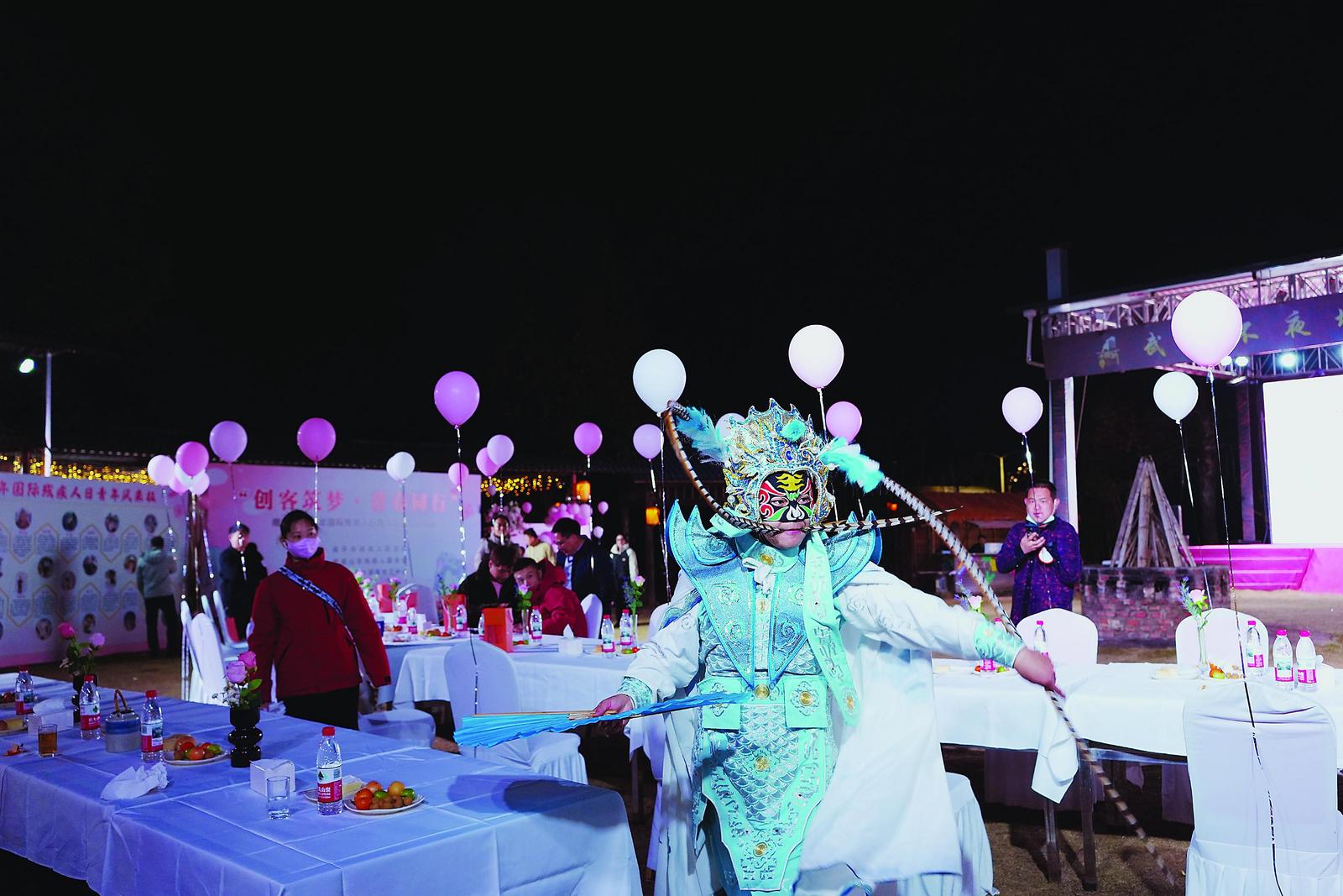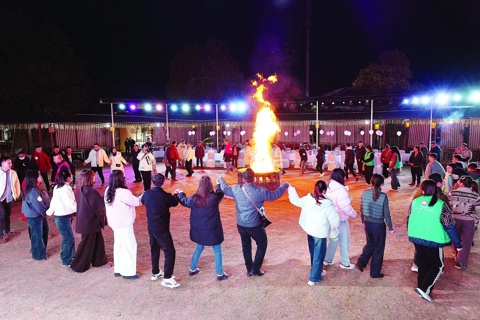 在三木自驾营地,人们围着火焰载歌载舞,传统变脸表演引来阵阵喝彩与掌声。