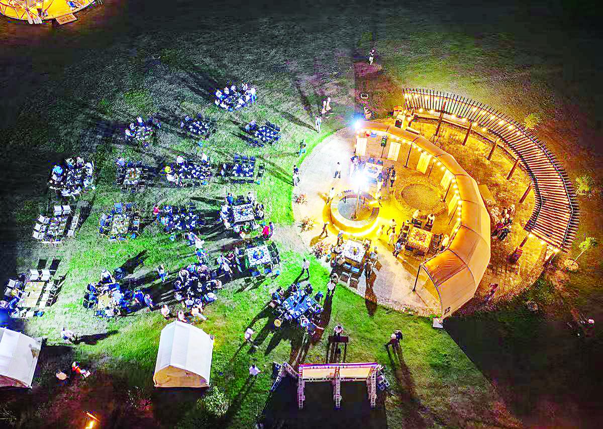 营地建在古镇旁一片开阔地上,远处青山连绵,近处是收割后留下整齐稻茬的田地。帐篷和天幕散落田间,与古镇的古建筑相映成趣,构成一幅自然与人文交融的画面。