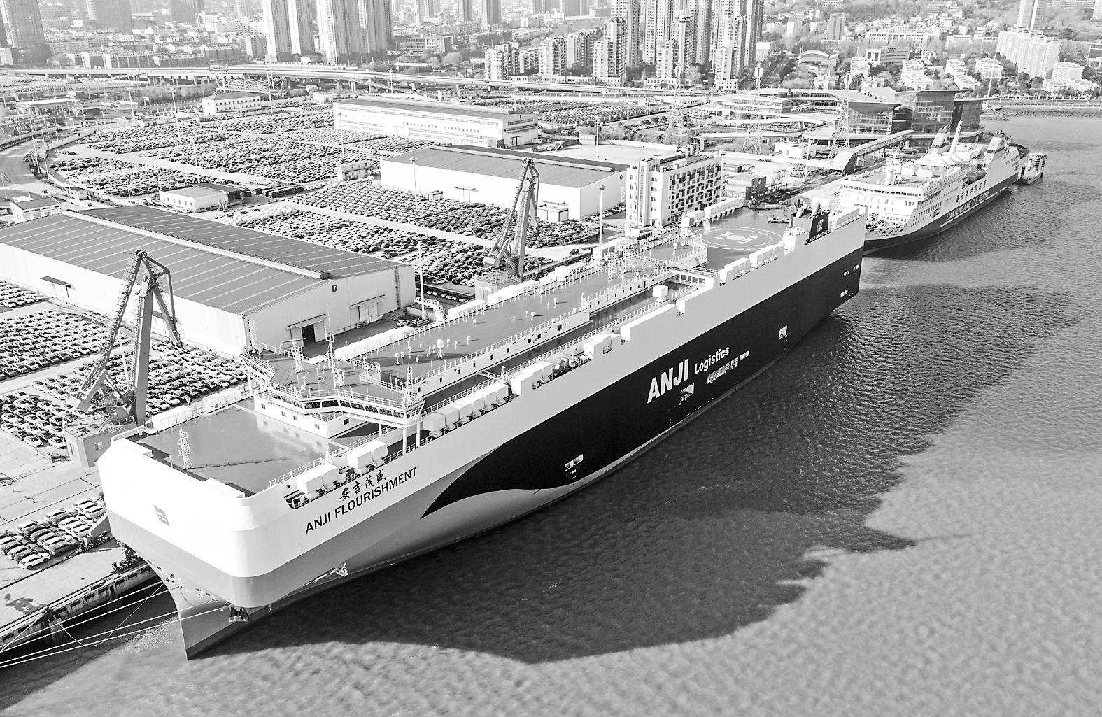 2025年12月17日,在江苏连云港港口68号泊位,一艘滚装船在装运出口汽车(无人机照片)。