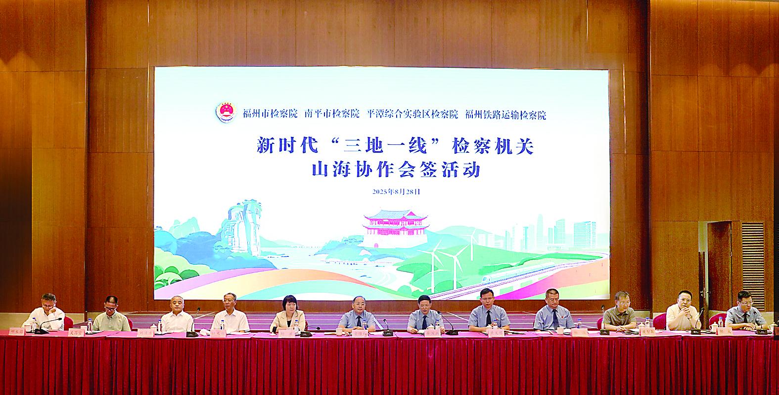 2025年8月28日,福州市检察院、南平市检察院、平潭综合实验区检察院、福州铁路运输检察院共同签署《新时代“三地一线”检察机关山海协作方案》,携手开启山海协同、路检联动的检察履职新篇章,推动构建从山顶到海洋的保护治理大格局。