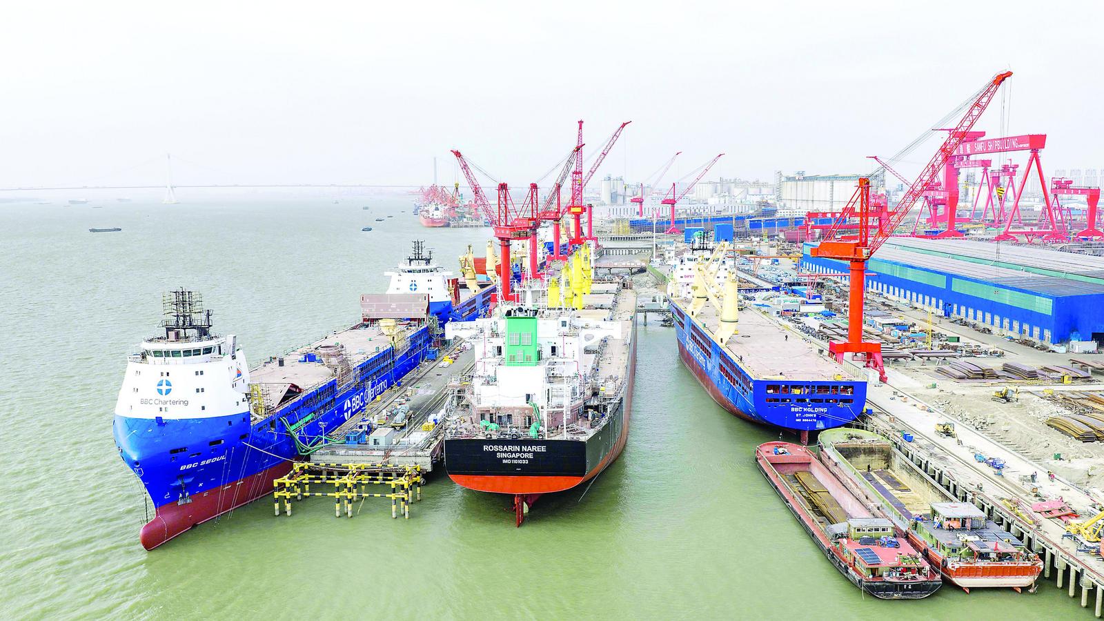 1月11日,在位于江苏省泰州市高港区的泰州三福船舶工程有限公司生产基地,多艘大型船舶在建造中(无人机照片)。 (新华社发 周社根 摄)