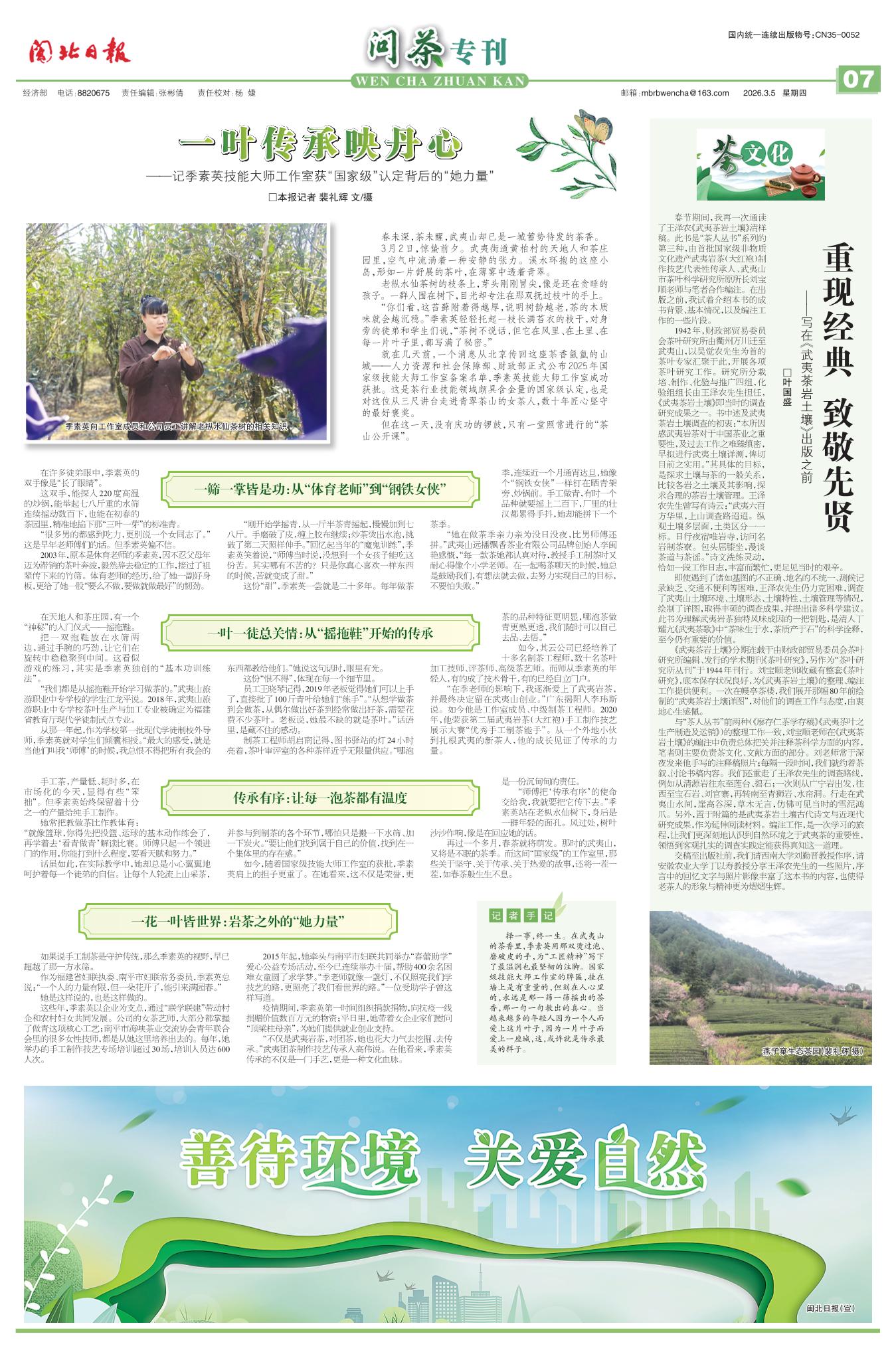 择一事,终一生。在武夷山的茶香里,季素英用那双烫过泡、磨破皮的手,为“工匠精神”写下了最温润也最坚韧的注脚。国家级技能大师工作室的牌匾,挂在墙上是有重量的,但刻在人心里的,永远是那一筛一筛摇出的茶香,那一句一句教出的真心。当越来越多的年轻人因为一个人而爱上这片叶子,因为一片叶子而爱上一座城,这,或许就是传承最美的样子。