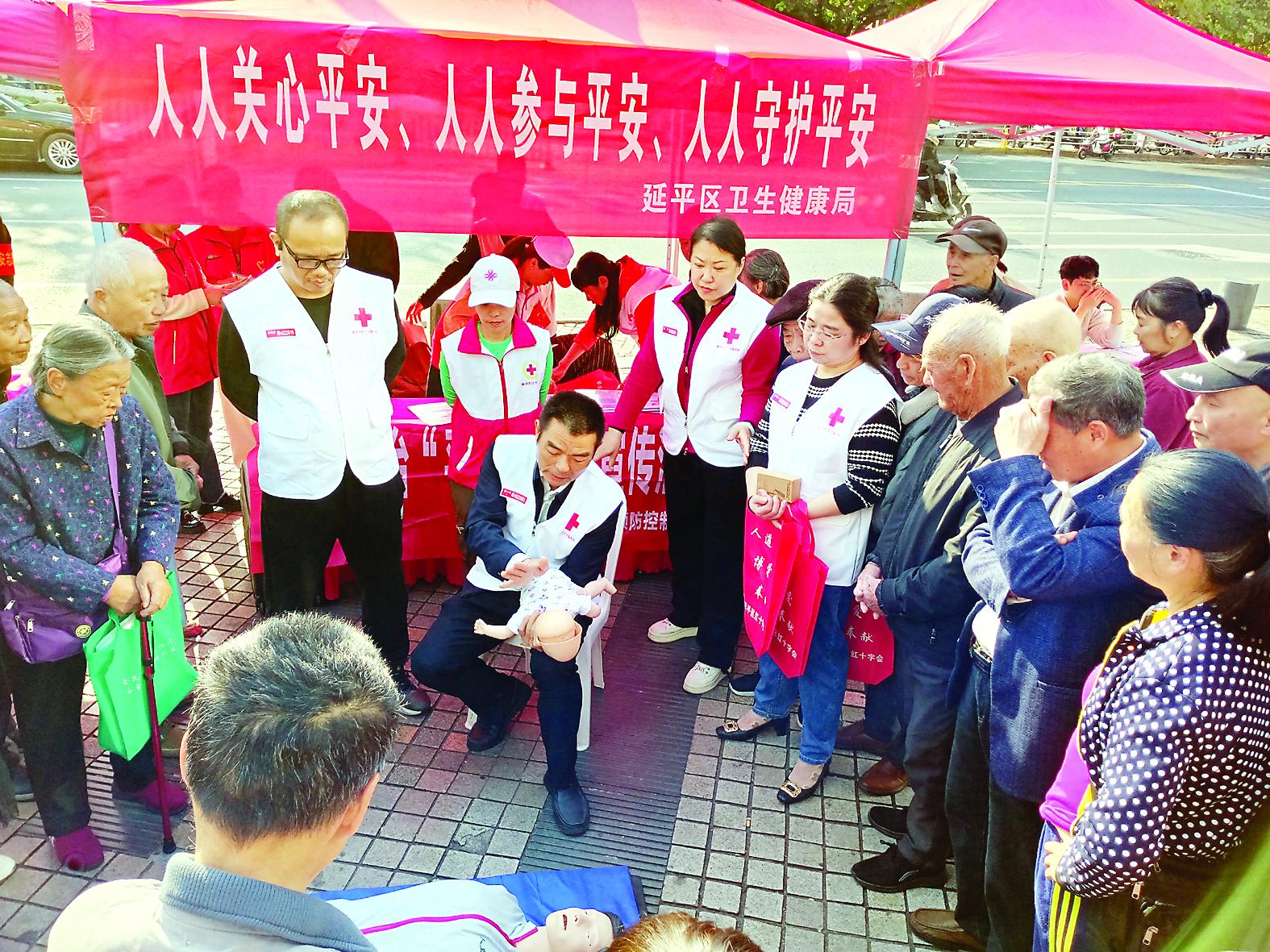 志愿者指导群众学习婴儿咽喉异物急救方法