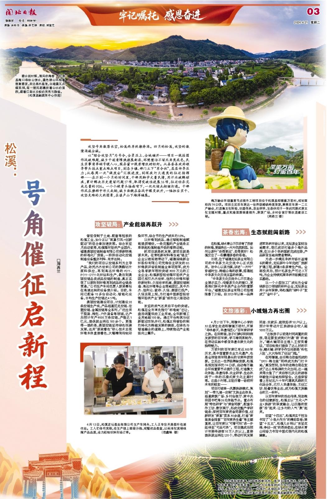 回望“十四五”,松溪用实干担当书写了“小县大作为”的精彩答卷;展望“十五五”,松溪儿女将以“攻坚克难、争创一流”的昂扬姿态,在绿水青山间奋力书写中国式现代化的松溪篇章。