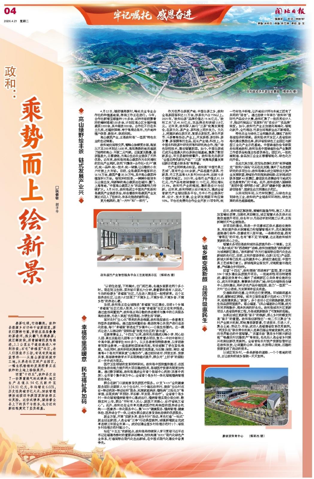 春茶吐绿,竹海翻浪。政和县澄源乡石仔岭千亩茶园里,茶农们腰挎竹篓,穿梭在层层叠叠的茶垄间,指尖翻飞采摘春茶;城区解放街,沥青摊铺机轰鸣推进,1.1公里主干道改造进入冲刺阶段;石屯“幸福里”社区,老人们围坐手工坊,有说有笑地组装零件……从高山茶园到城市工地,从养老社区到产业园区,一幅生机勃勃的发展图景正在政和的土地上徐徐展开。