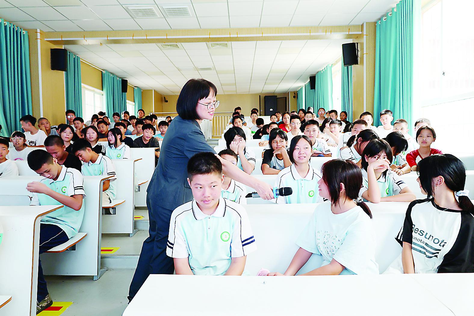 近日,光泽法院组织人员前往光泽县第一中学圣农新城附属学校开展“开学第一课”法治宣传教育活动,为到场的师生细致讲解了玩笑与欺凌之间的界限,分享了预防与应对欺凌的具体办法,积极引导学生运用法律武器保护自身权益,勇敢向校园欺凌说“不”。图为法官与学生互动。 (连昕 官诗扬 摄)