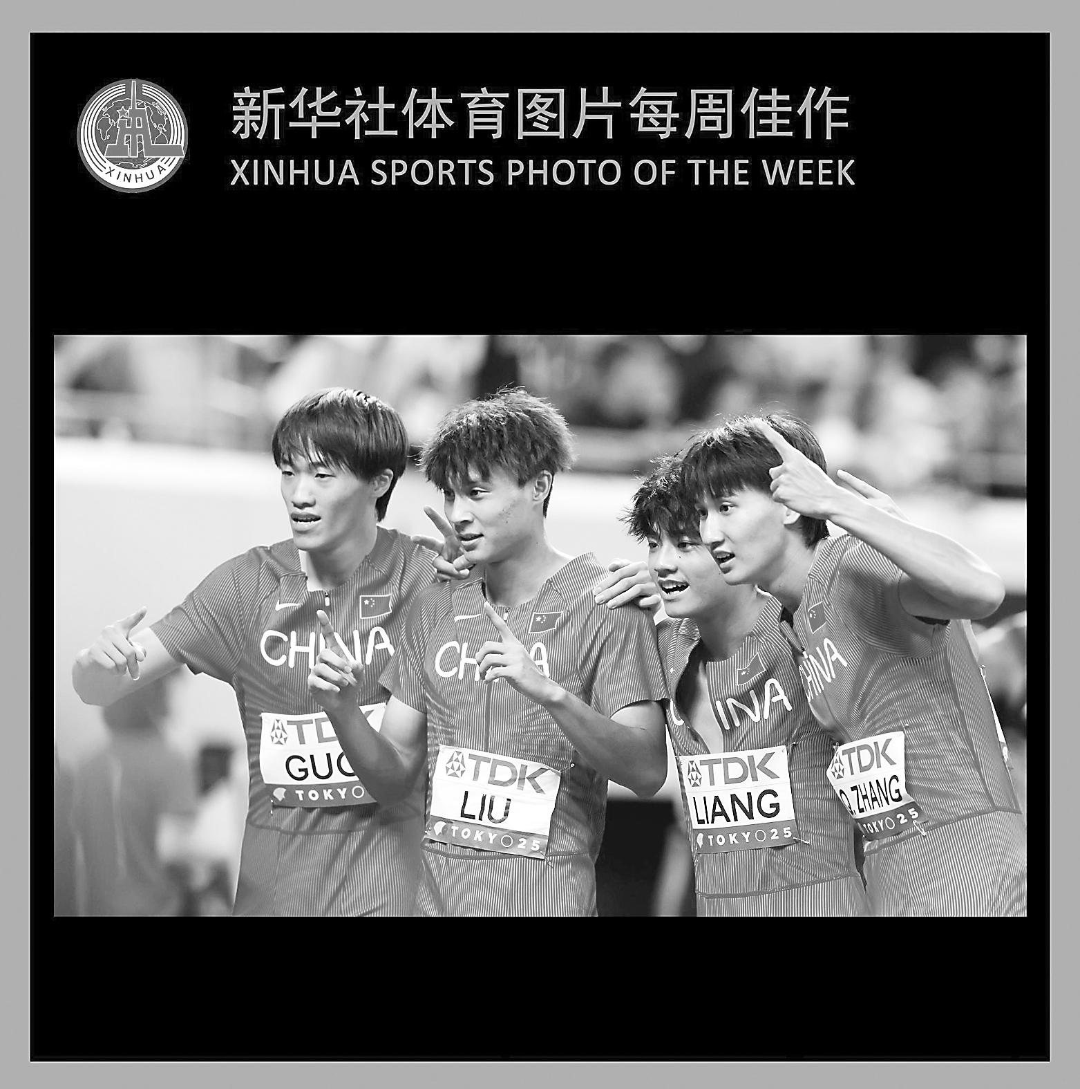9月20日,中国队选手郭龙宇、刘凯、梁宝棠、张起宁(从左至右)在2025年世界田径锦标赛男子4x400米接力预赛后庆祝。 (新华社记者 王丽莉 摄)