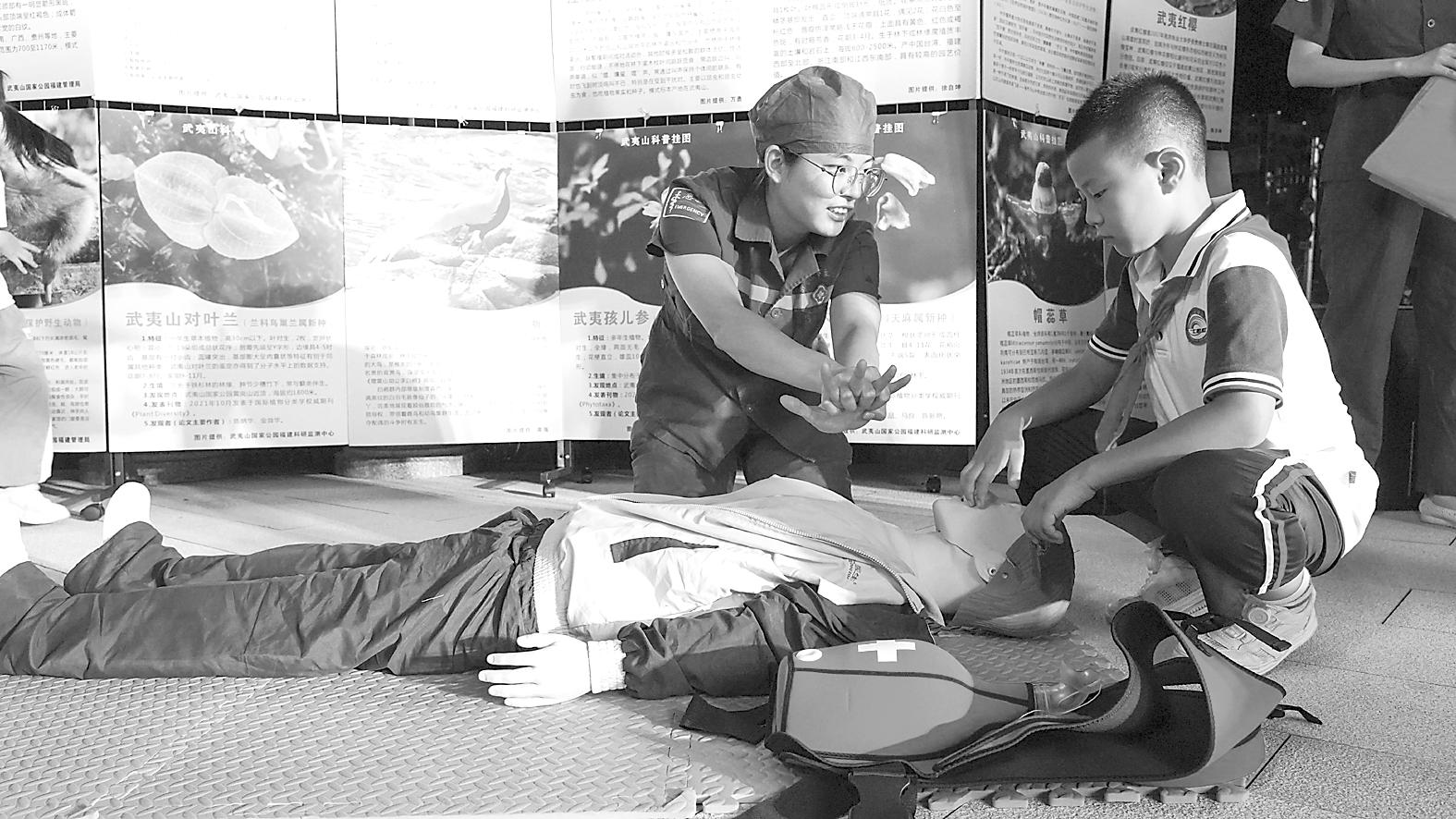 日前,武夷山市举办全国科普月活动。活动以“提升全民科学素质,夯实科技强国基础”为主题,向市民传播科学知识。图为医护人员演示心肺复苏等实用急救技能。