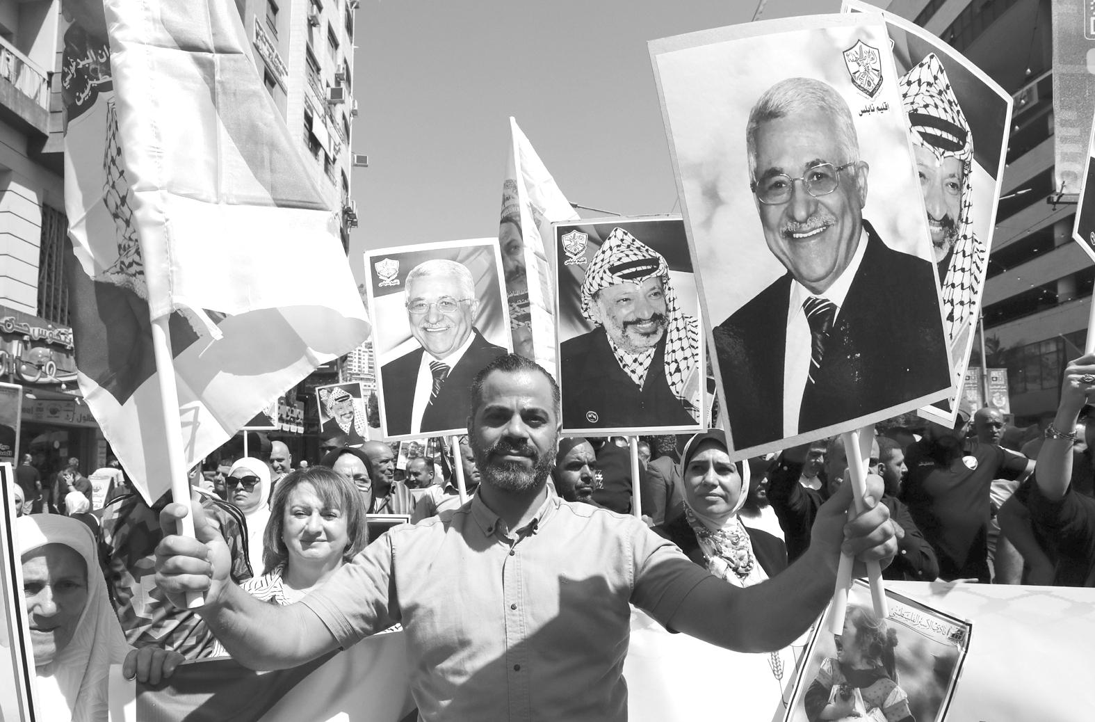 9月23日,在约旦河西岸城市纳布卢斯,民众挥舞巴勒斯坦领导人阿拉法特和阿巴斯画像参加庆祝活动。