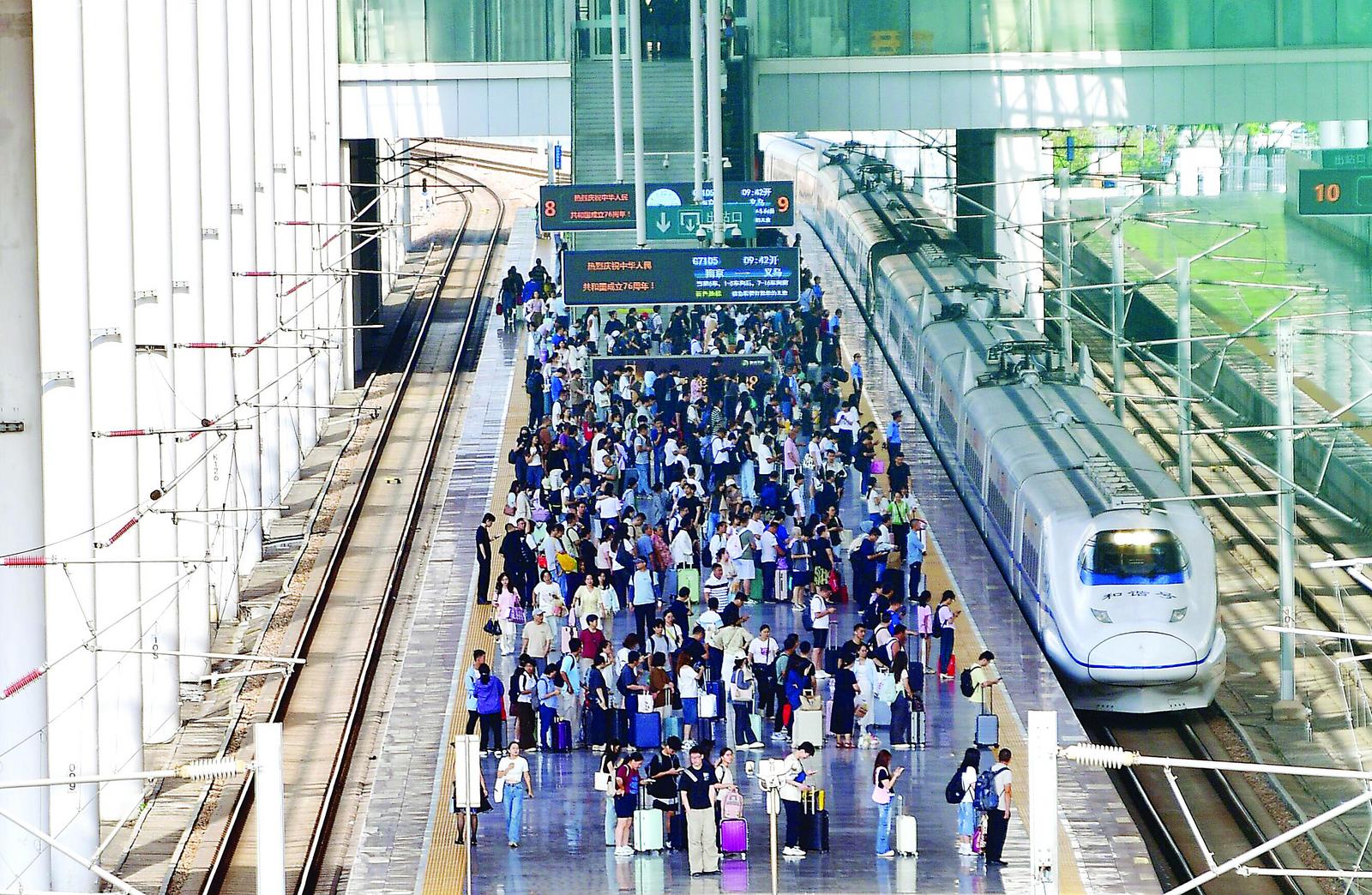 10月8日,旅客在江苏无锡火车站站台乘车。
