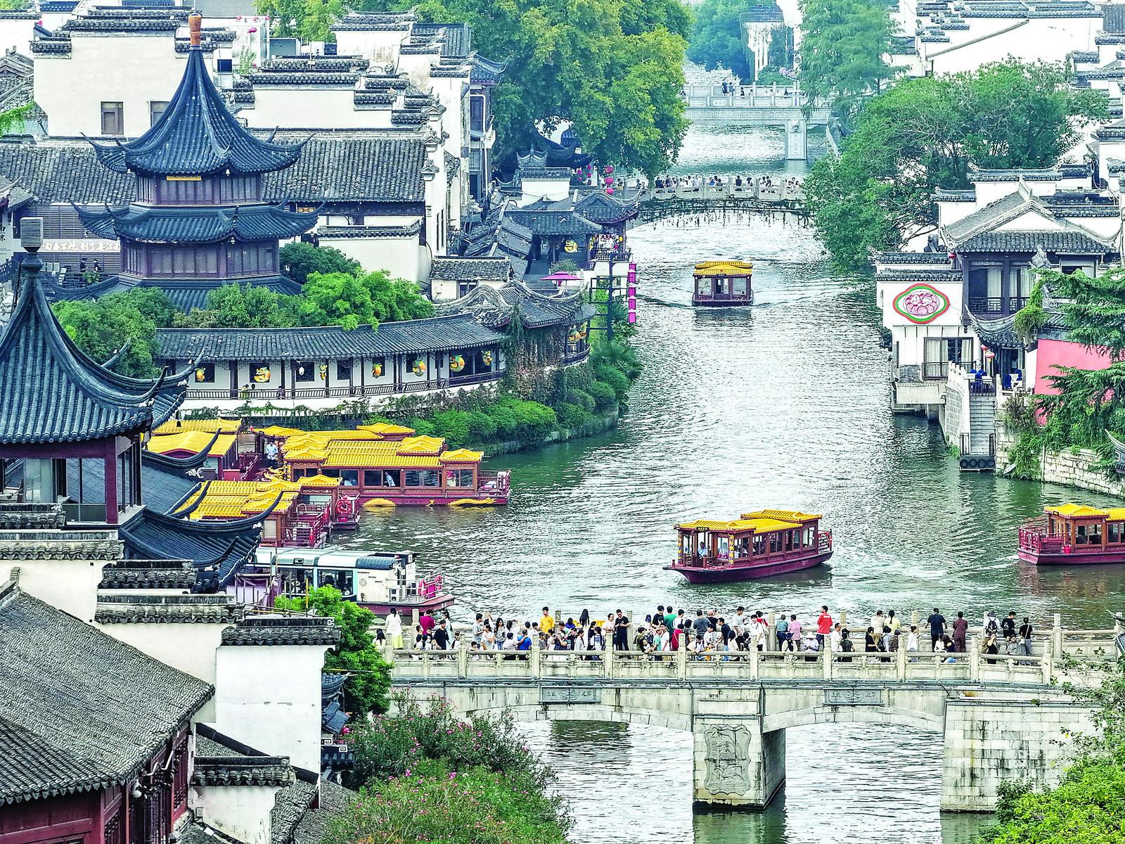 10月7日,游客在江苏省南京市秦淮区的夫子庙景区休闲游玩(无人机照片)。 (新华社记者 李博 摄)