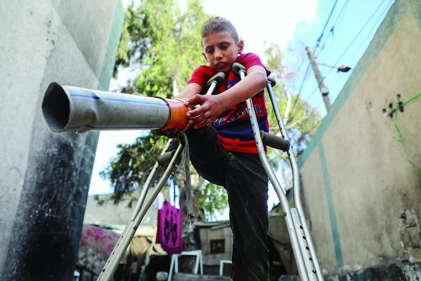 10月5日,年仅10岁的少年拉提卜·阿布·卡里克在加沙地带中部代尔拜拉赫附近的联合国临时安置机构内拄着拐杖安装假肢。在数月前的一次以色列空袭中,拉提卜失去了右腿致残,他的母亲和兄弟也在袭击中身亡。
