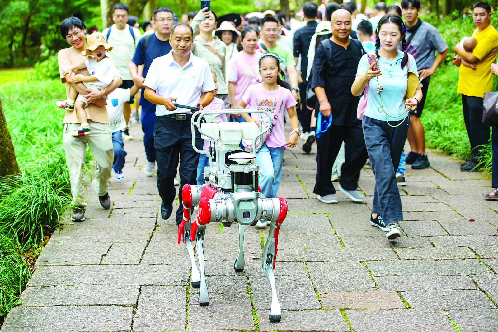 在武夷山景区,机器狗参与巡逻,与游人互动。(张筱惜 彭善安 摄)
