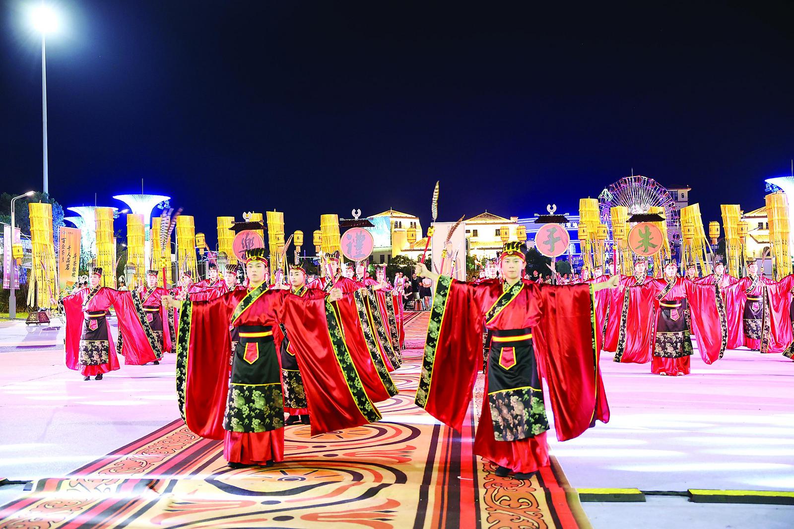国庆中秋假期,《月映武夷》开演前,演员们在剧场前的武夷广场上,为游客奉上朱子礼乐大典表演。