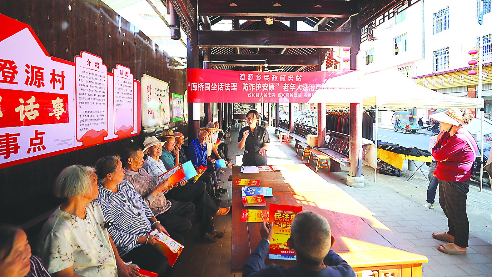 为筑牢老年人财产安全防线,10月9日,政和县法院联合县民政局、松溪县善成社会工作服务中心等单位开展法治宣传活动。图为活动现场,法院干警围绕“民间借贷防诈骗”,结合本地真实案例,拆解“高息返利”“虚假借贷”等常见诈骗套路。 (高思妃 范美芳 摄)