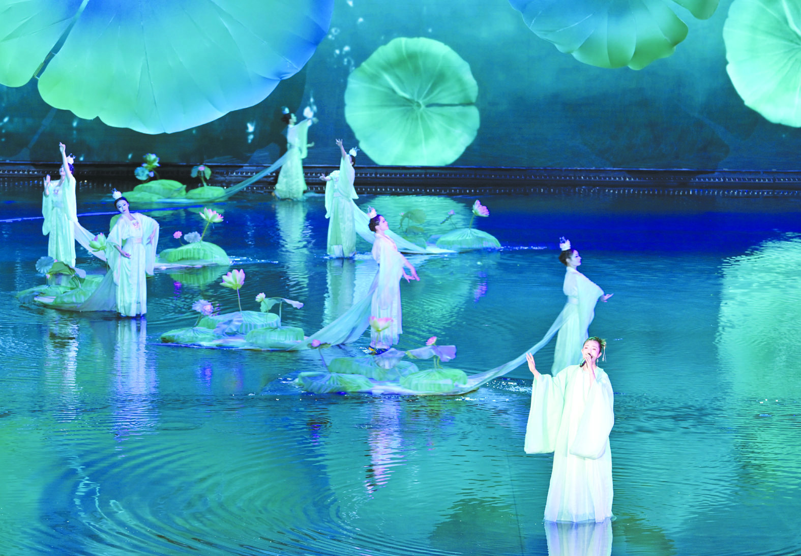 从舞美对平行透视布景的反复推敲,到视觉运用裸眼3D技术打磨画面;从演员七星面妆考究设计,到龙鱼等舞台道具艺术制作;从不同篇章的色调与内涵呼应,到音乐与光影配合渲染气氛……每一处细节都彰显“山水入画屏”的匠心。