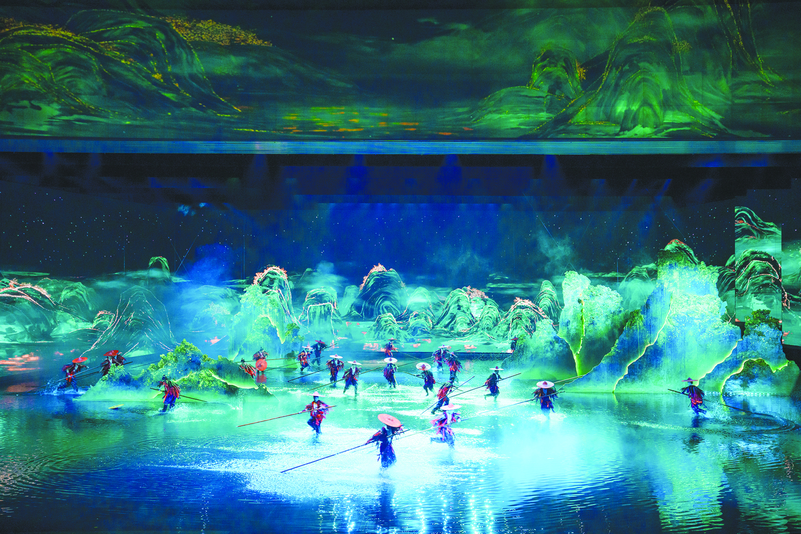 长45米、宽10.3米罕见比例的运用,让台口化作东南奇胜长卷;4块IMAX屏幕大小的LED屏将其环绕,构成270°巨大投影面,将观众的余光都悉数捕捉;而全智能多功能水舞台,能够在一秒间由地面切换为一汪碧水。