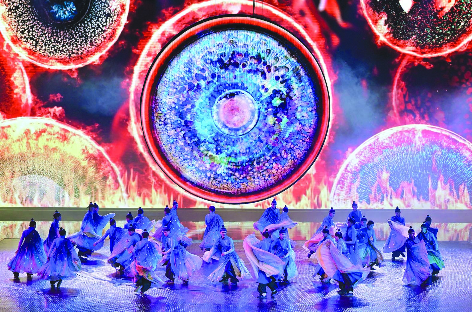 演出以朱子文化为哲学内核,分为月映万川、鉴天、叩山、家礼、悟心、万川归一等篇章。借助水幕、数控、光影等科技赋能,将音乐、舞蹈、戏曲等艺术语言和视觉影像、舞台装置等技术手段融为一体。