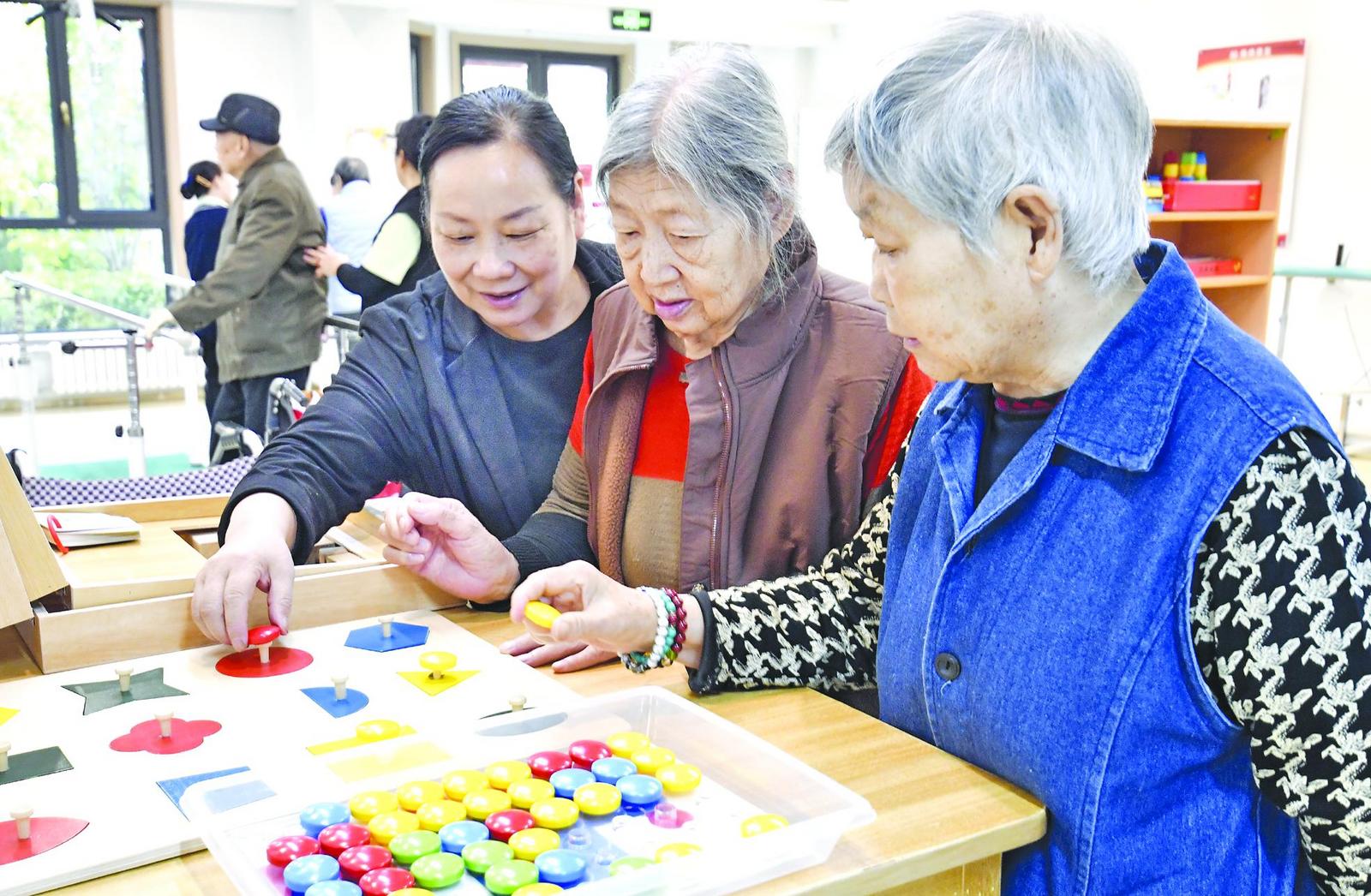 10月17日,老人们在北京市朝阳区来广营区域养老服务中心福寿苑养老公寓内玩智力游戏。