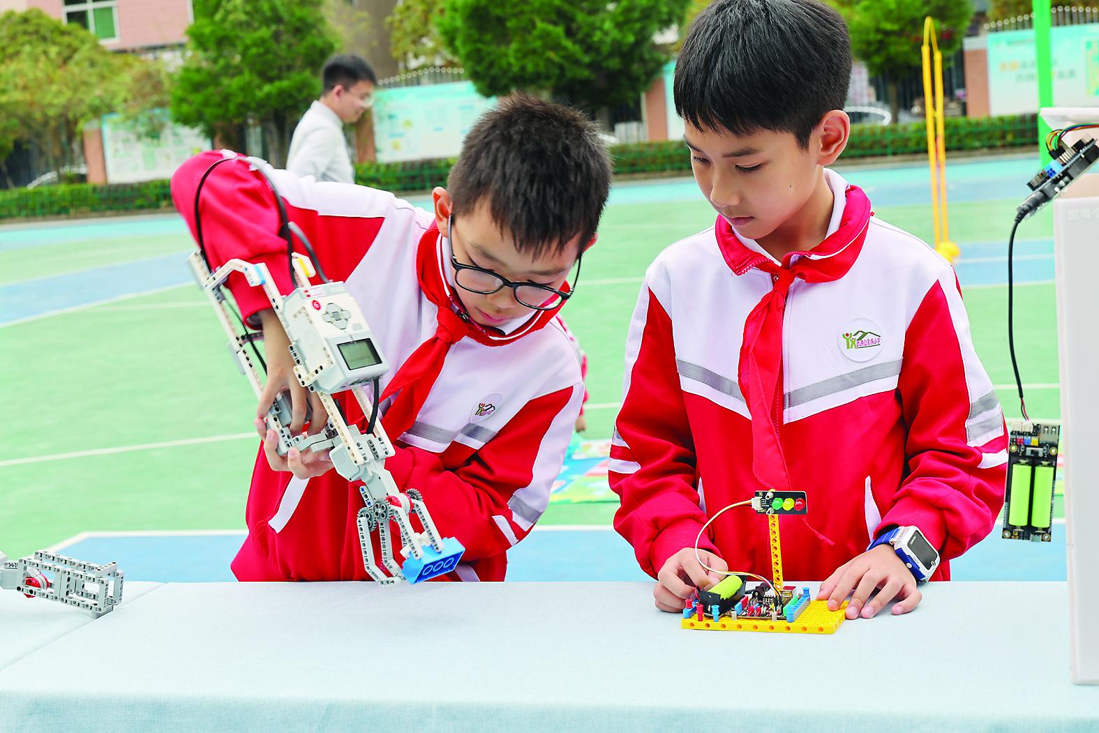 10月31日,由福建省教育厅主办的“科学筑梦,点亮未来”福建省中小学科学教育系列活动南平专场在武夷山市举行。活动设置了课程展板区、科学互动体验区、科创区以及科技作品区等多个功能区,通过寓教于乐的方式,让学生们在动手实践和亲身体验中感受科学的魅力。图为学生在试用机械手拿物品。(邱汝泉 摄)
