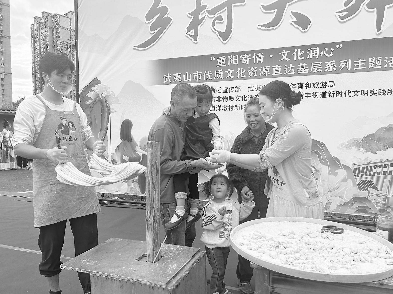 10月29日,“乡村大舞台”武夷山市优质文化资源直达基层系列主题活动走进新丰街道洋墩村。活动现场,手鼓《请到武夷来吃茶》、舞蹈《花开中国》、歌曲《最亲的人》《父亲写的散文诗》、八段锦表演、经典戏曲《智斗》等节目精彩上演,让村民们在家门口就能享受精彩的文化活动。互动环节“品乡村米糖·话敬老真情”,更是点燃现场群众参与的热情。图为互动环节现场。(张筱惜 摄)