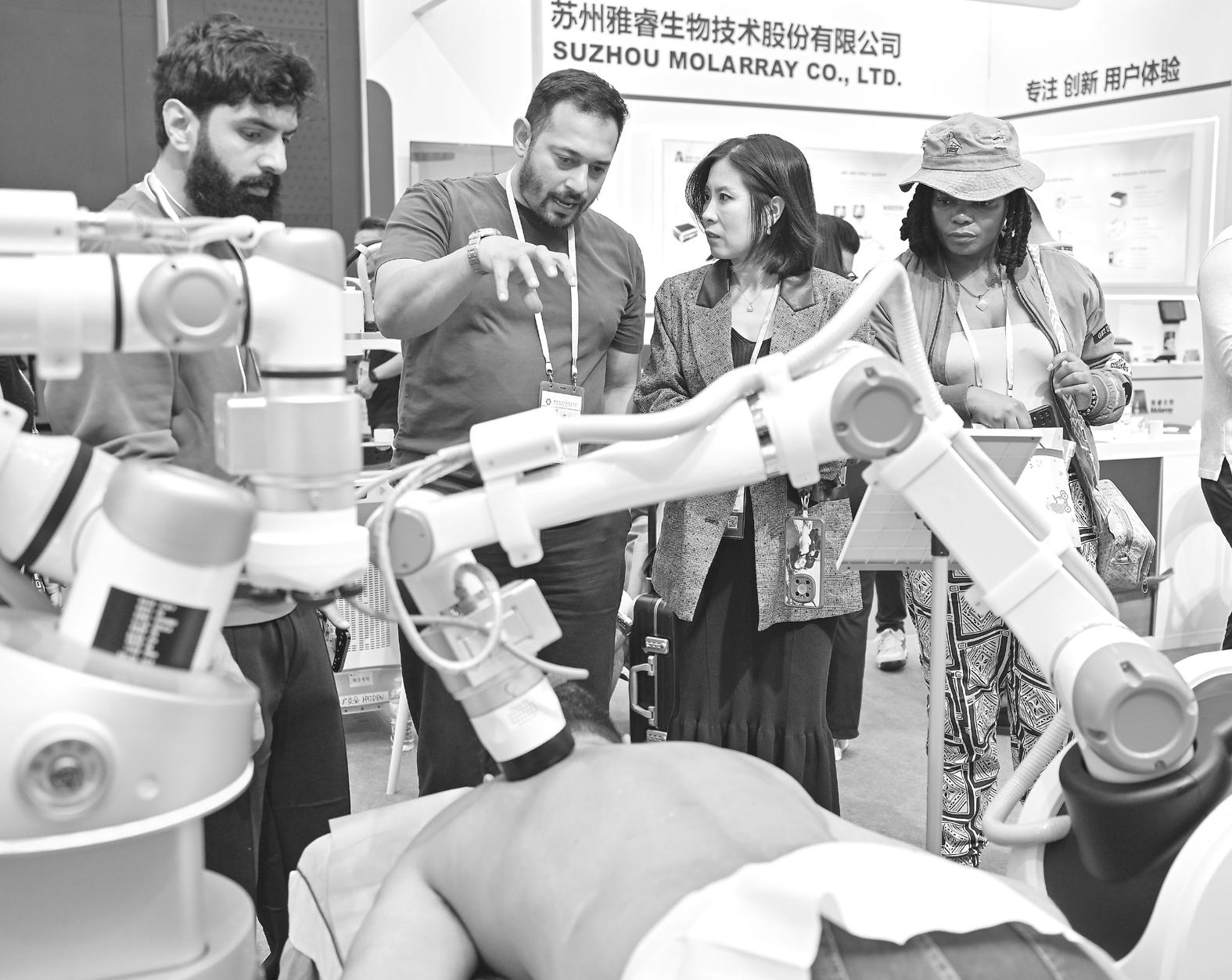11月3日,客商在广交会展馆了解一款理疗机器人。