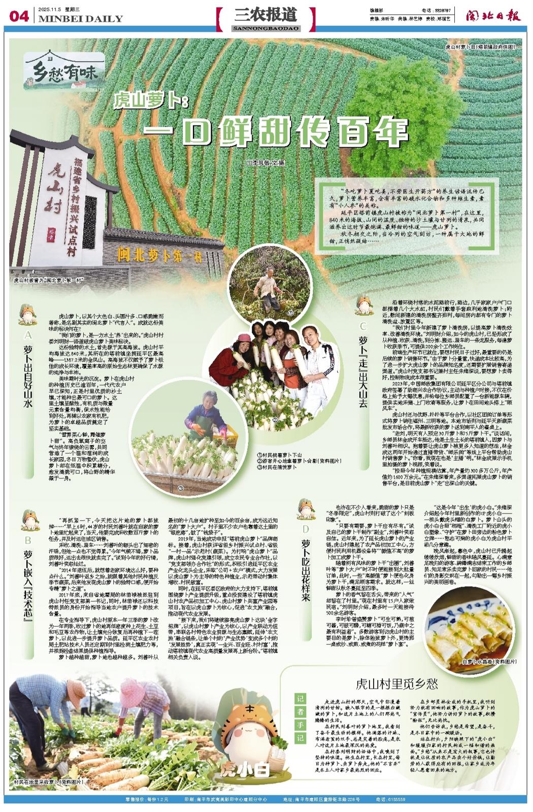 延平区塔前镇虎山村被称为“闽北萝卜第一村”,在这里,840米的海拔、山间的温度、独特的沙土壤与甘冽的清泉,共同滋养出这时节最饱满、最鲜甜的味道——虎山萝卜。