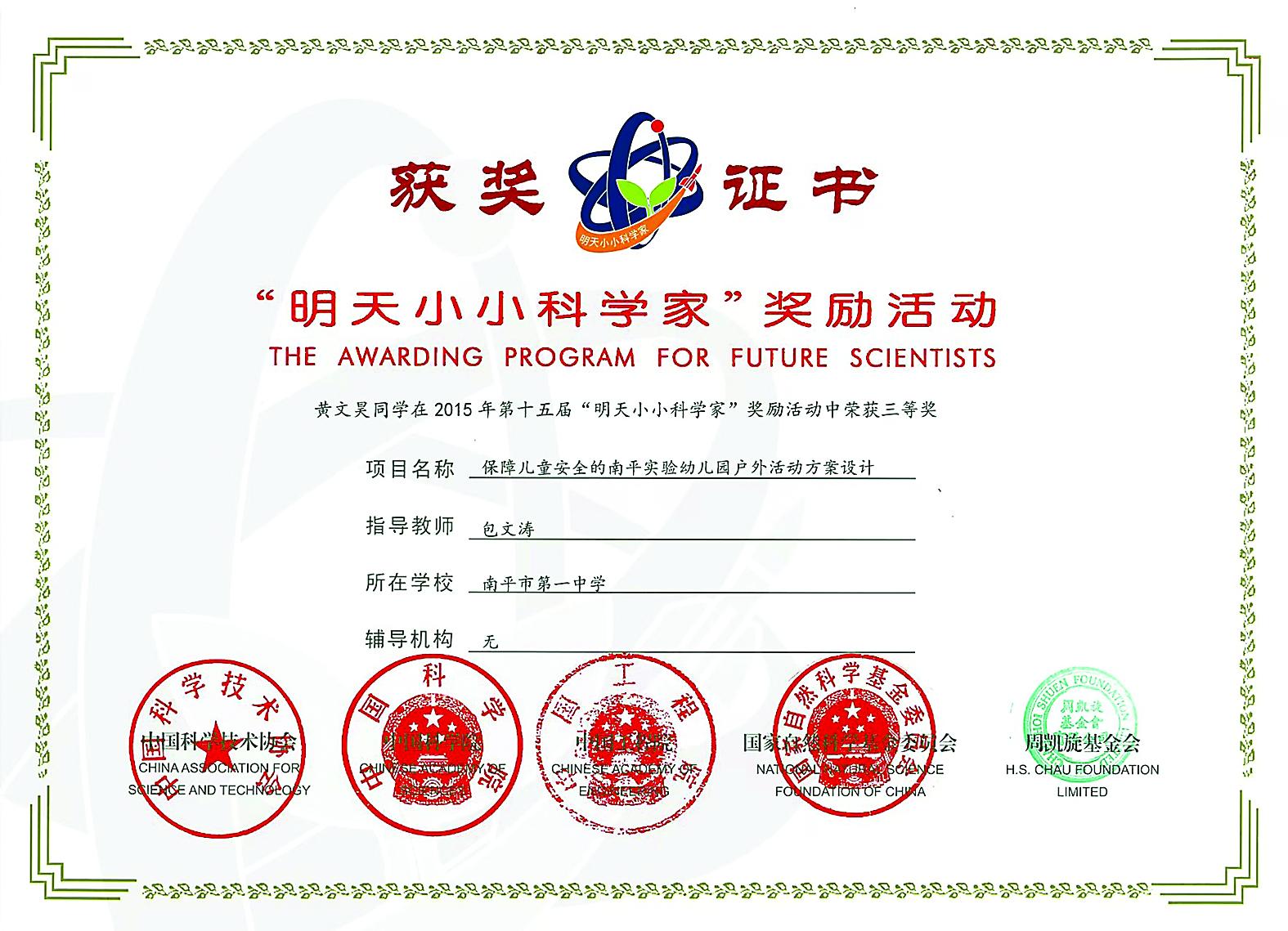 黄文昊同学便是其中之一。他的科研之路,始于一份朴素而深沉的社会关切。这份责任感,驱使他将目光投向了南平实验幼儿园的户外活动安全,并以此为课题,完成了《保障儿童安全的南平实验幼儿园户外活动方案设计》的研究。
