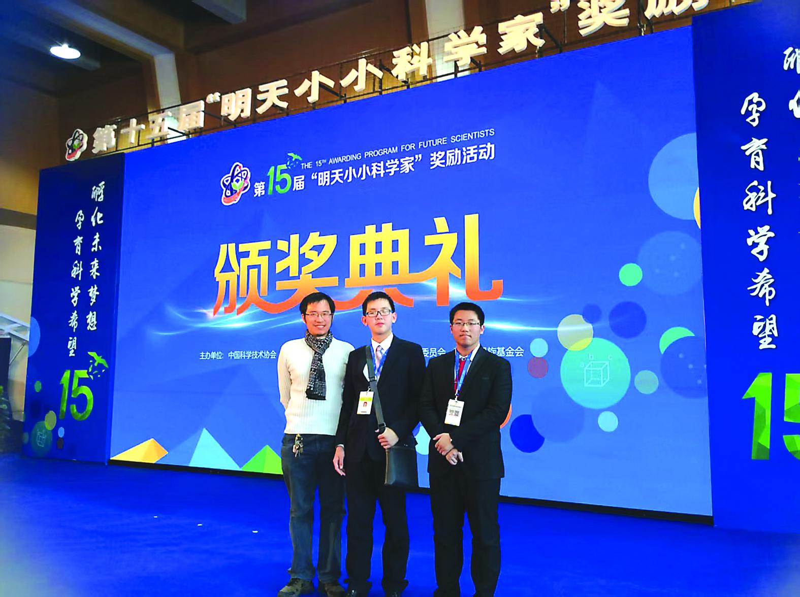 黄文昊(中)在第15届“明天小小科学家”奖励活动颁奖现场
