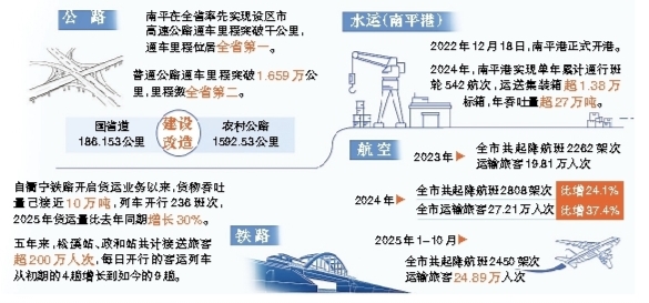 五年来,南平市以习近平新时代中国特色社会主义思想为指导,立足新发展阶段,全面贯彻新发展理念,以满足人民日益增长的美好生活需要为根本目的,以加快建设交通强国、交通强省为目标,充分发挥规划引领作用,高起点、高标准推进沙南高速建设、闽江航道整治、南平港延平新城港区建设等,推动闽江复航,衢宁铁路投用,公路基础设施网络持续完善,为经济社会发展提供坚实支撑。