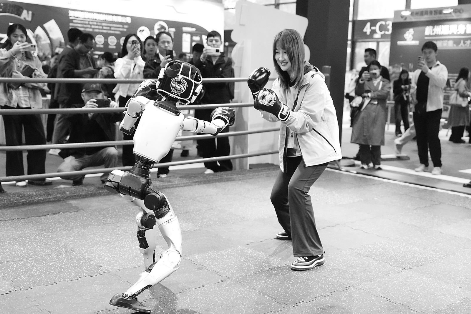 在今年新设的“赛BOT SHOW场”体验空间,来自宇树科技的人形机器人在擂台上进行了多轮紧张刺激的格斗演示赛。