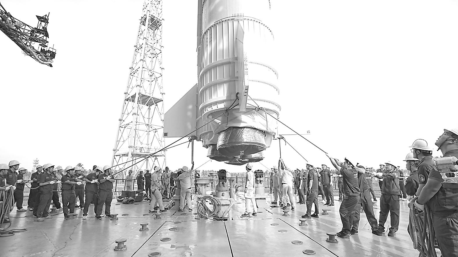 11月11日,发射场工作人员对长八甲遥五火箭进行吊装作业。