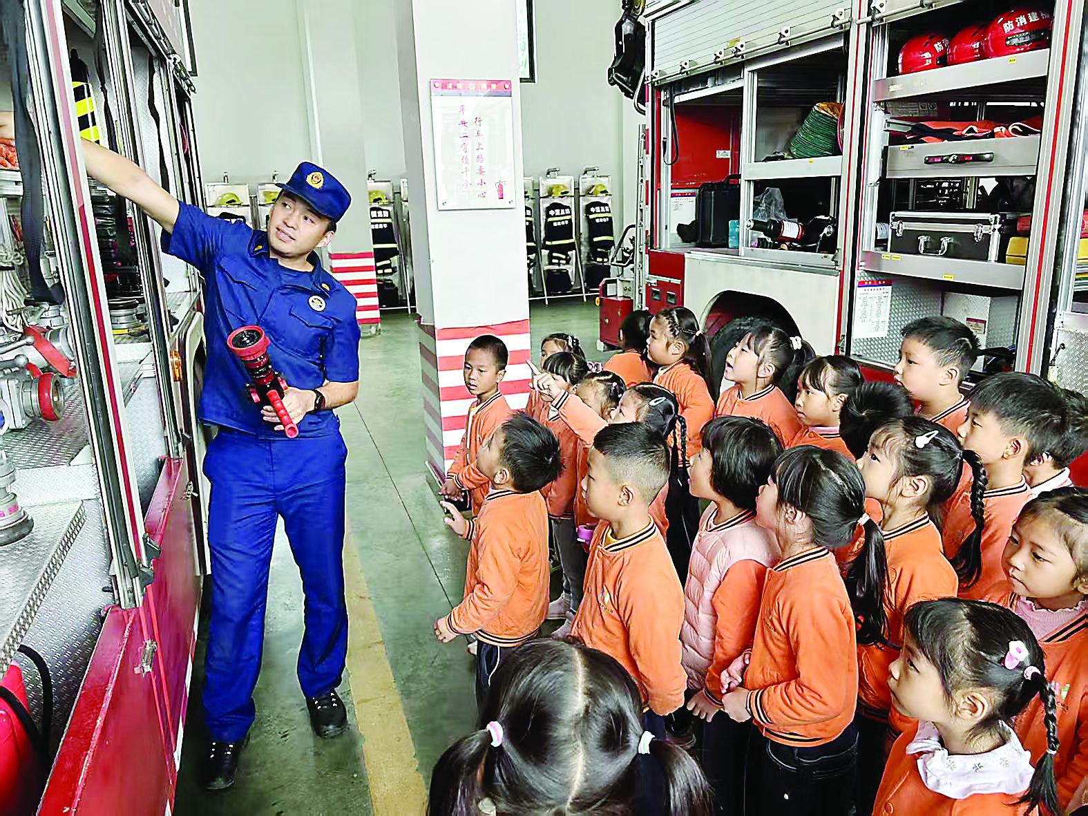 近日,武夷山实验幼儿园组织大班100余名幼儿走进武夷山市消防救援大队,开启一场生动有趣的消防安全启蒙之旅。图为孩子们在消防车旁听消防救援人员讲解车内各类救援设备。 (张筱惜 摄)