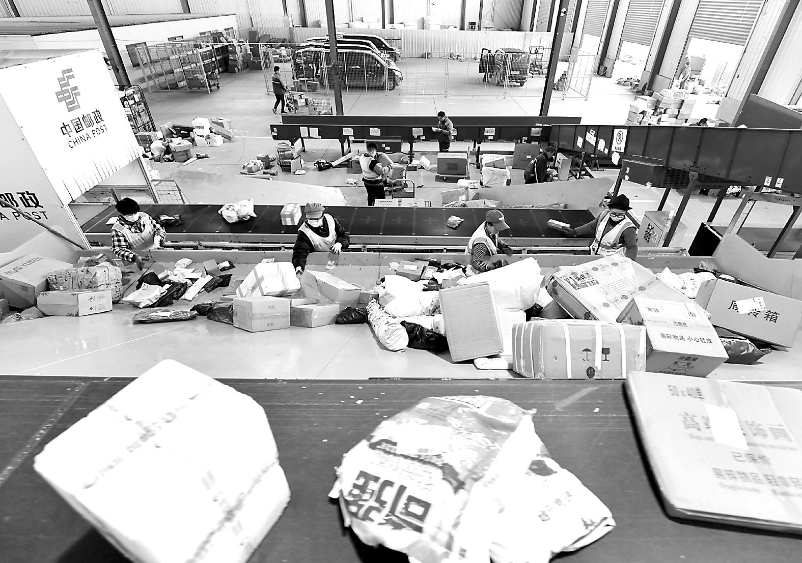 11月11日,工作人员在中国邮政集团有限公司河北省石家庄市栾城区分公司分拣快递。 ( 新华社发 李明发 摄)