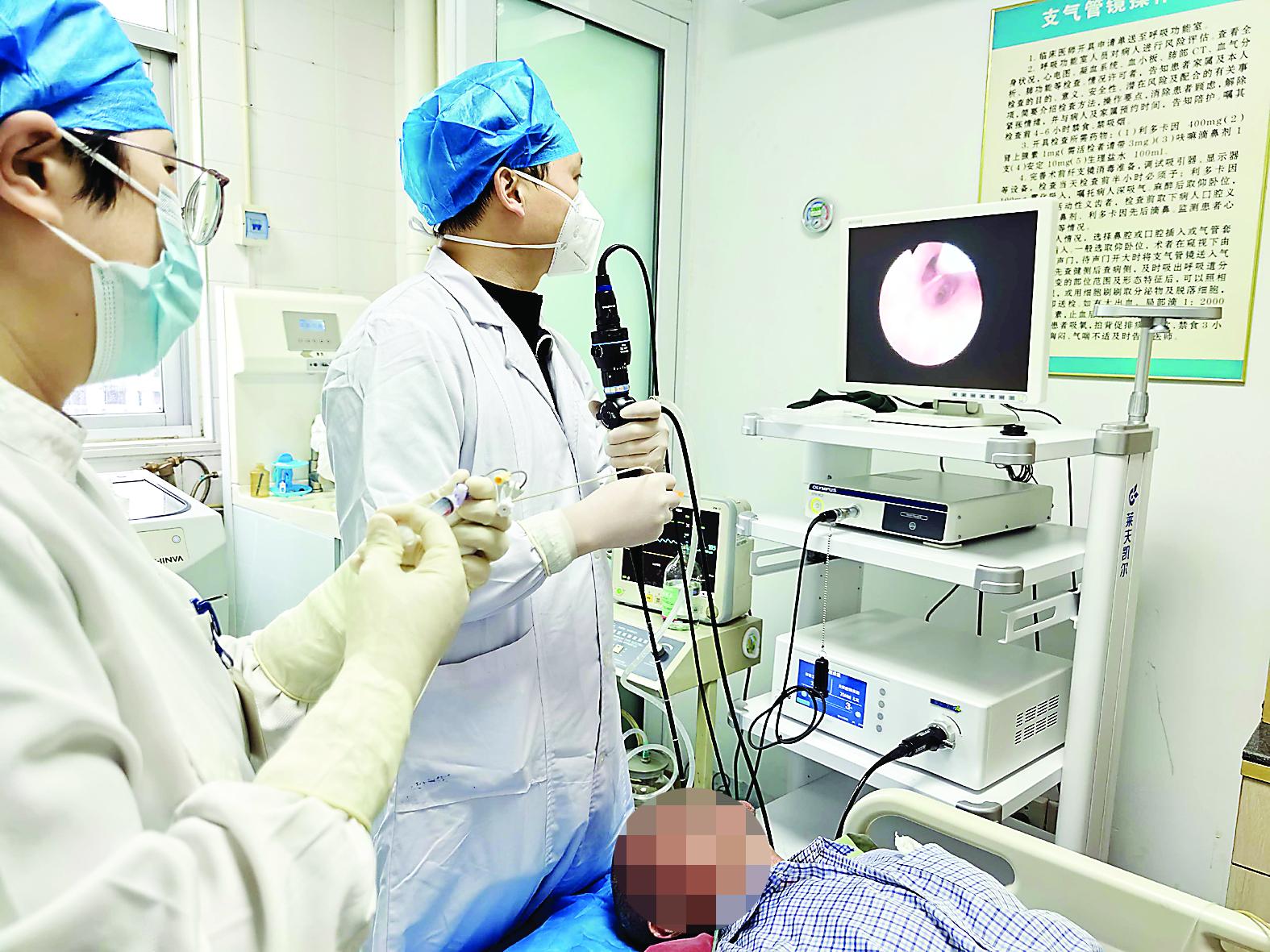 南平市人民医院肺病科主任吴慧毅(右)在为患者做气管镜