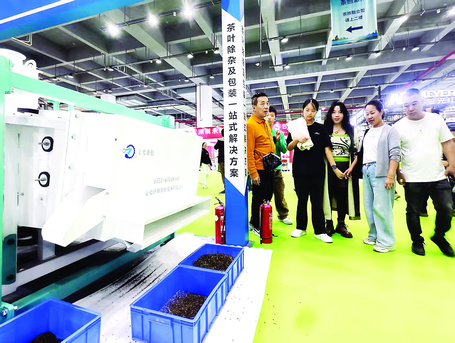 在茶机械展区,安徽捷迅光电技术有限公司带来了全自动茶叶除杂机,引得不少客商前来询问。“我们的机械完全数控,只需要通过电子屏幕操作,配合包装机使用,可以完成茶叶质选、除杂、包装等系列操作。”负责人唐文翼热情地向大家介绍。