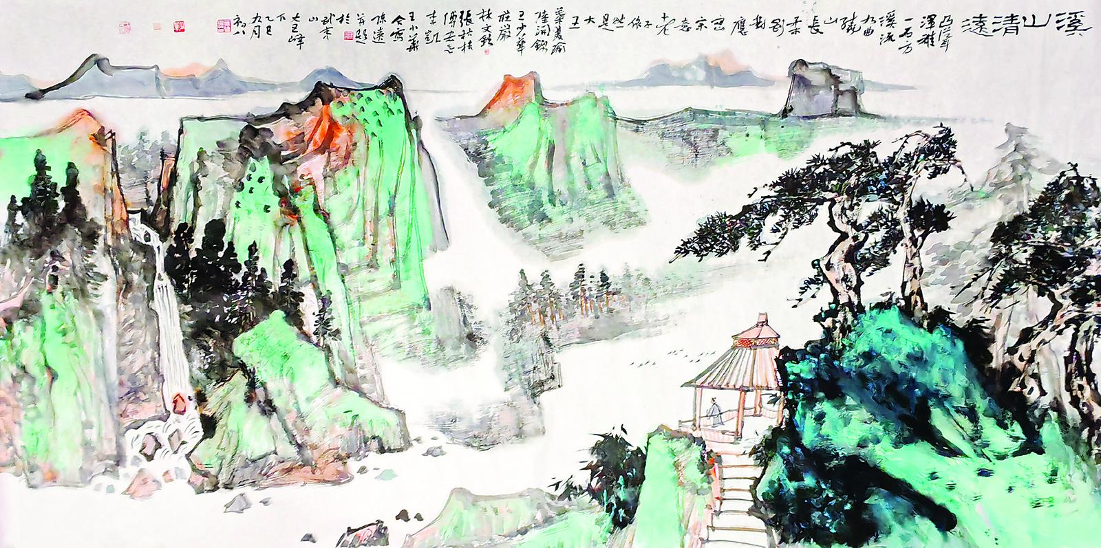福建省人大书画院与全省九市一区人大书画院的书画师们现场共同创作了八尺画作——溪山清远