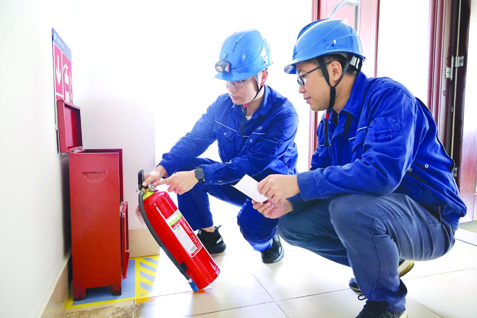 近日,华电南平能源公司紧紧围绕“全民消防、生命至上——安全用火用电”主题,将消防宣传月活动与安全大检查相结合,开展人员密集场所消防隐患排查整治行动,组织消防知识技能培训和应急演练,织密消防安全防护网。图为企业管理人员对消防器材进行检查。