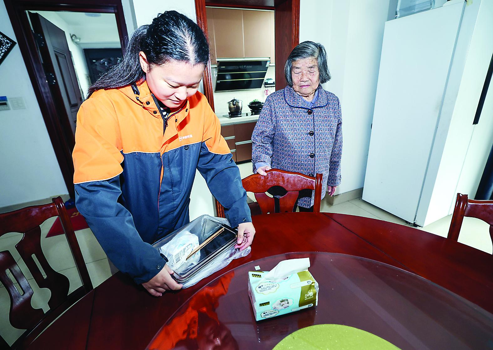 图为:11月7日,浙江省诸暨市陶朱街道“小哥志愿服务队”的快递员为辖区内行动不便的高龄、独居老人提供志愿送餐服务。 (新华社记者 徐昱 摄)