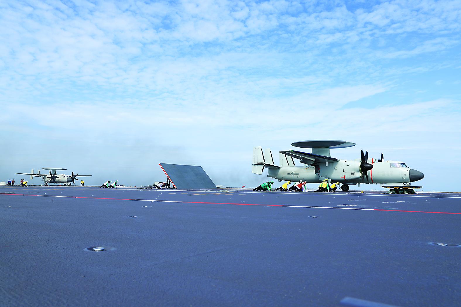 这是空警-600舰载固定翼预警机接续弹射起飞。 (新华社发 常新鹏 摄)
