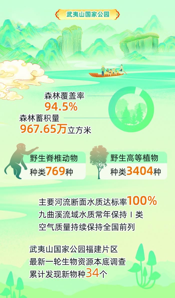 监测数据显示,目前,武夷山国家公园森林覆盖率达94.5%,森林蓄积量967.65万立方米;野生脊椎动物种类769种;野生高等植物种类3404种;主要河流断面水质达标率100%,九曲溪流域水质常年保持Ⅰ类,空气质量持续保持全国前列。武夷山国家公园福建片区最新一轮生物资源本底调查累计发现新物种34个。