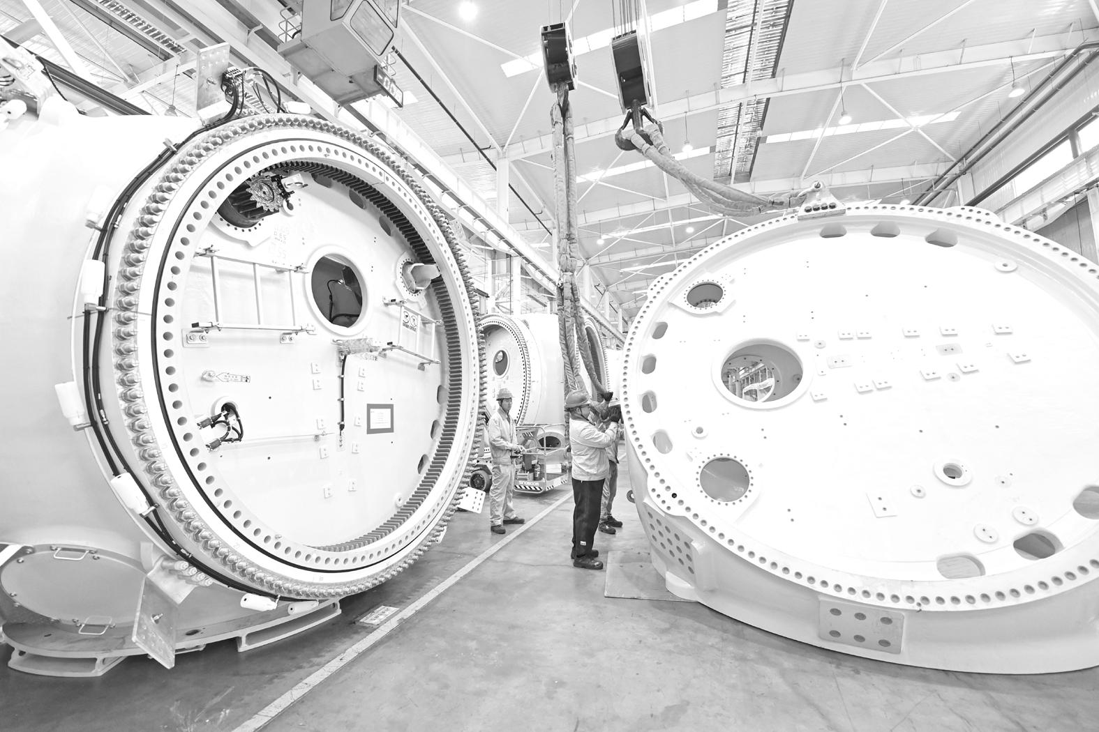 2025年9月24日,工人在位于山西转型综合改革示范区的太重集团新能源产业园区吊运风电装备。