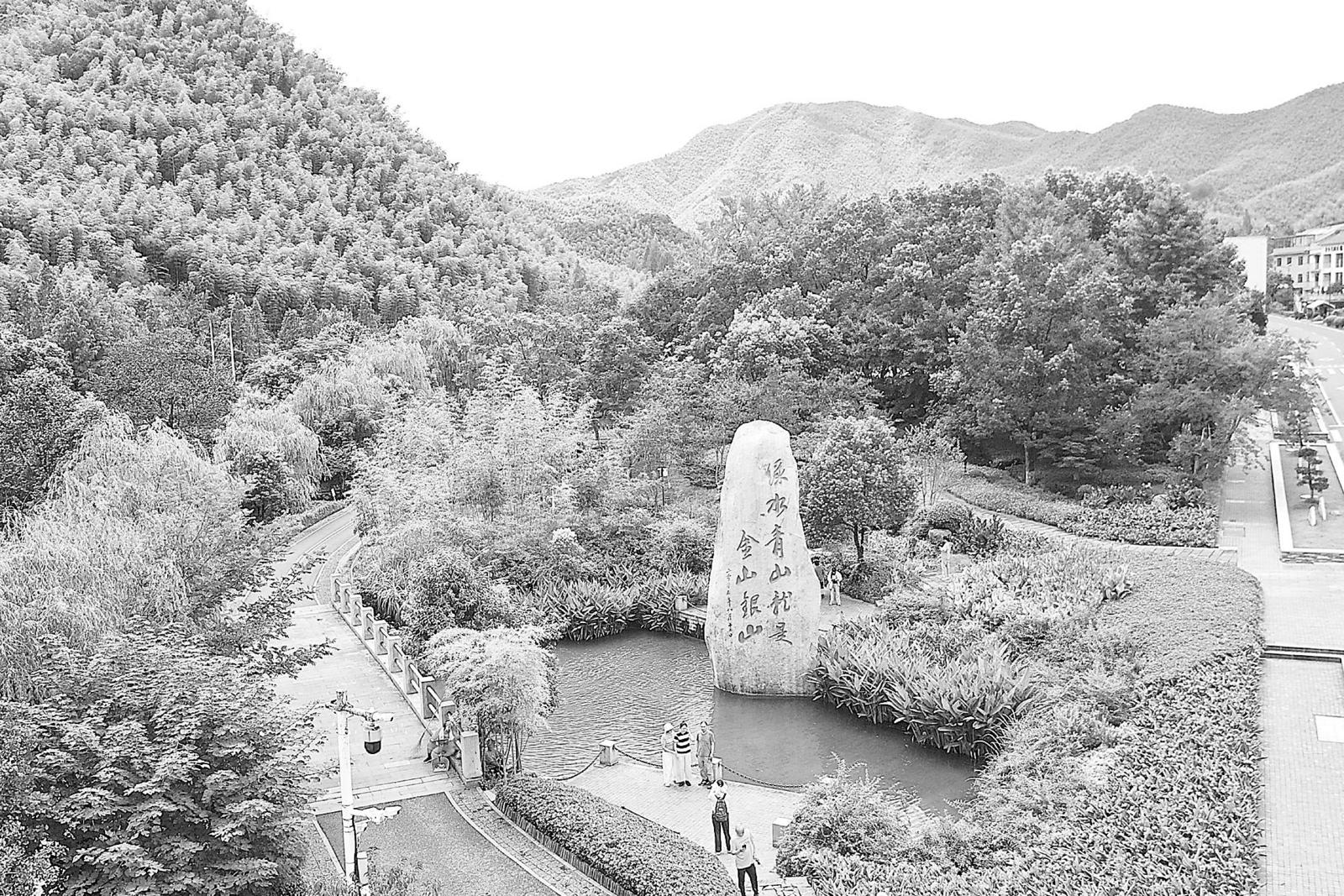 2025年8月6日,在浙江省湖州市安吉县余村,游客在刻有“绿水青山就是金山银山”的石碑前留影(无人机照片)。 (新华社记者 毛竹 摄)