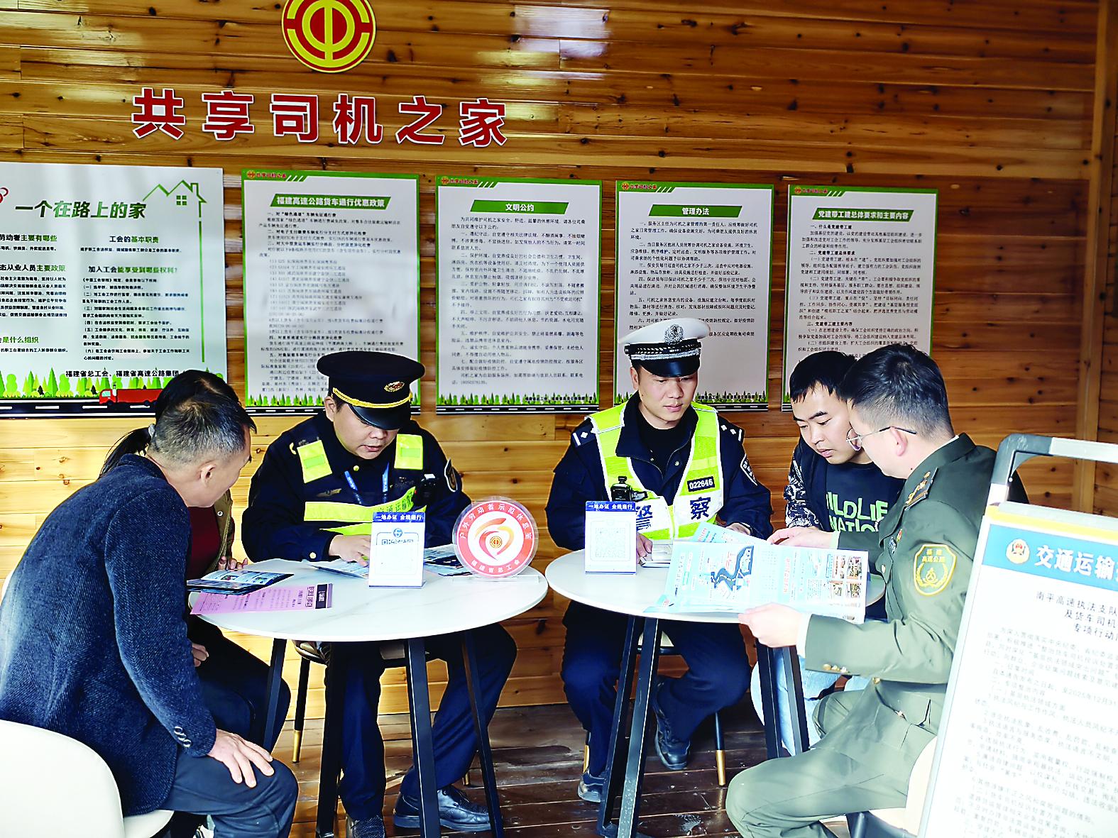 为保障过往司乘出行安全,11月18日,南平高速执法支队四大队、南平高速交警一大队、南平高速武夷山管理中心三方工作人员携手走进武夷山服务区“共享司机之家”,针对冬季行车特点开展宣传活动。图为执法人员向货车司机讲解安全行车注意事项。 (吕耀和 张天宝 摄)